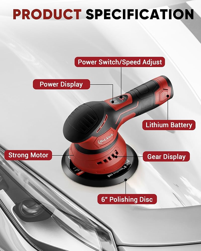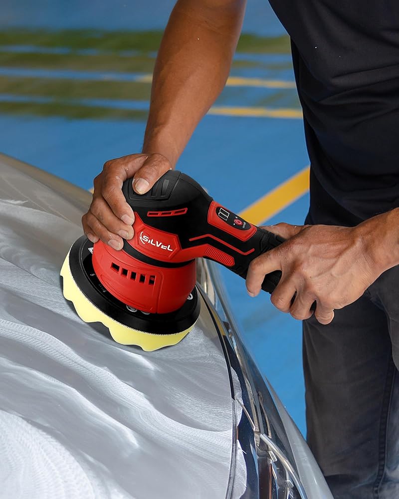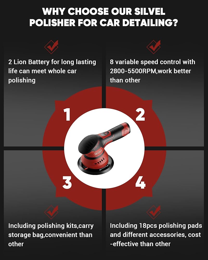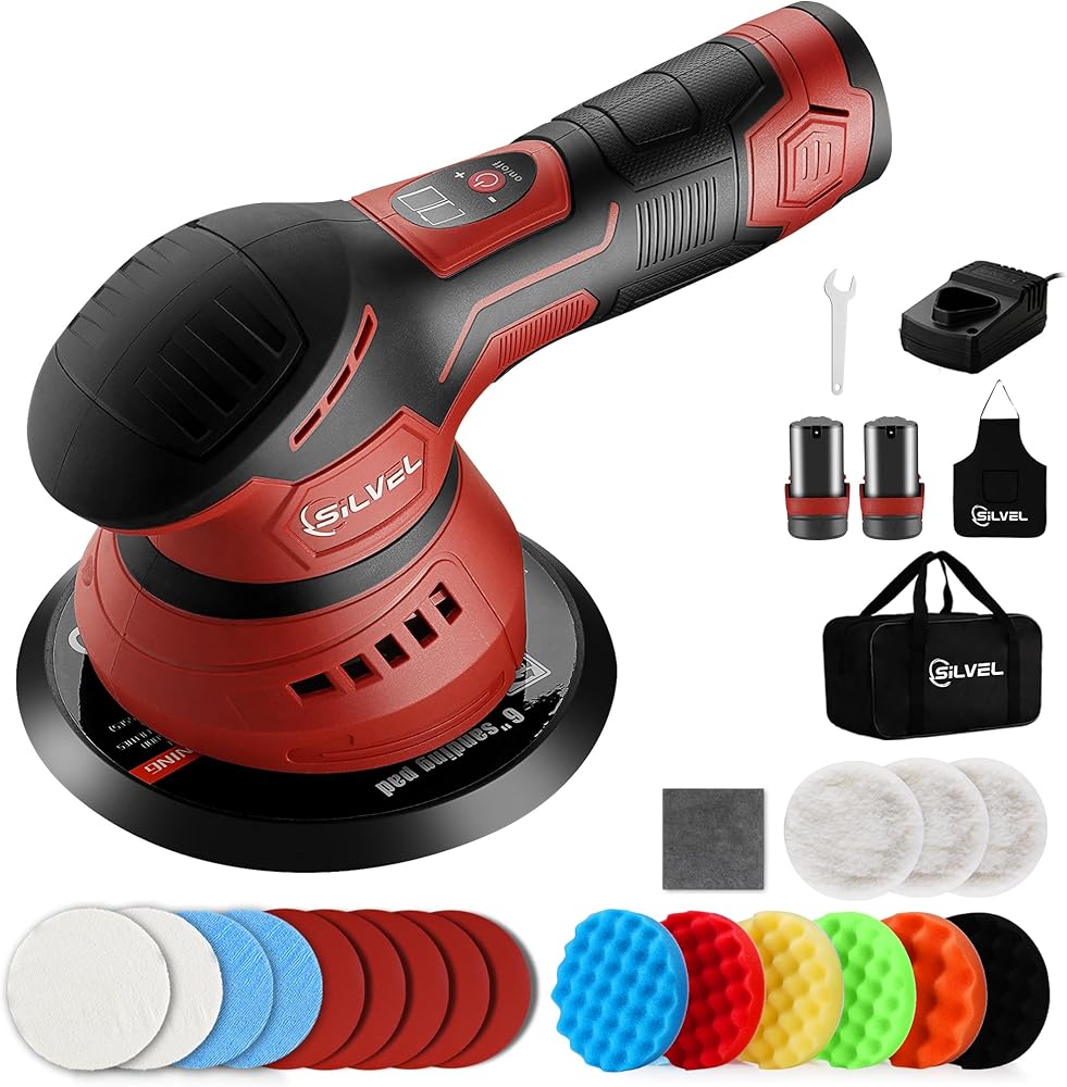 ملمع عازل لاسلكي من SILVEL، بطارية عالية السعة 2000 مللي أمبير في الساعة 12 فولت، مخزن مؤقت قوي مزدوج الحركة مع تحكم متقدم بـ 8 سرعات، ملمع بدون فرش 2800-5500 دورة في الدقيقة للسيارات والقوارب والجدران والأرضيات والأعمال اليدوية