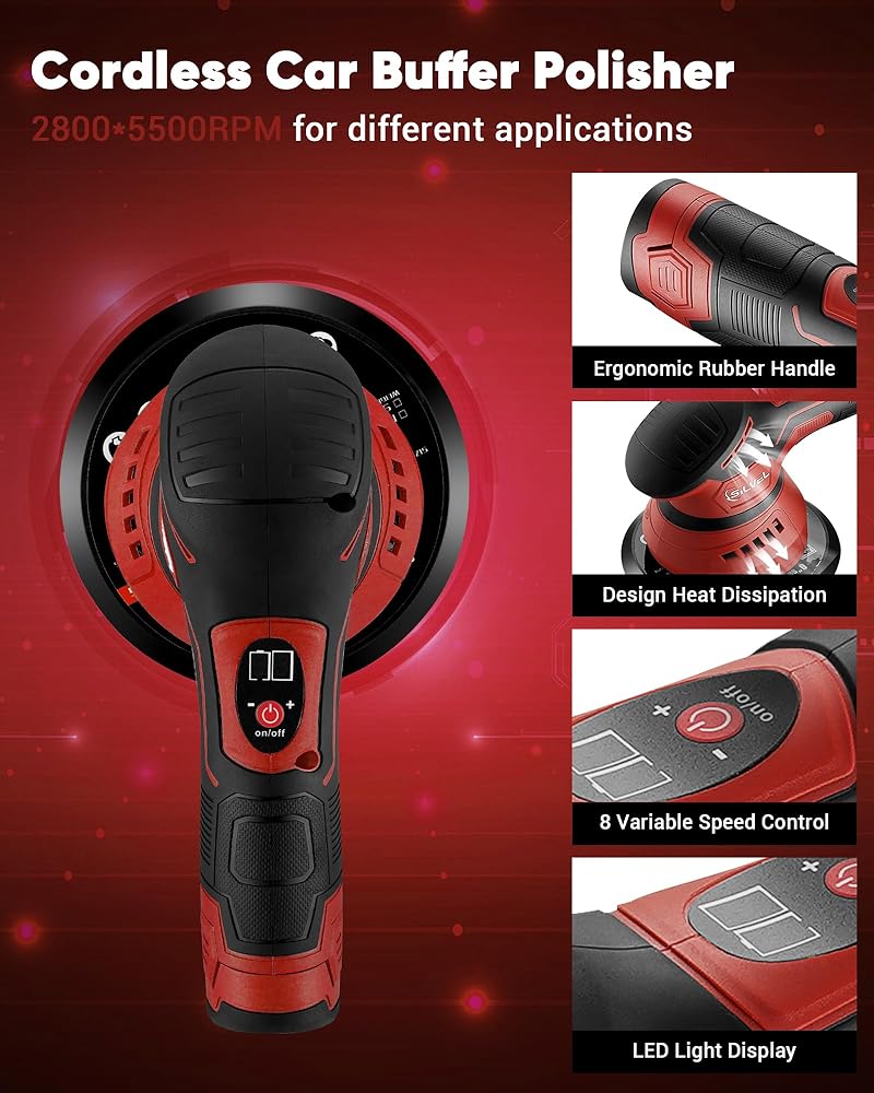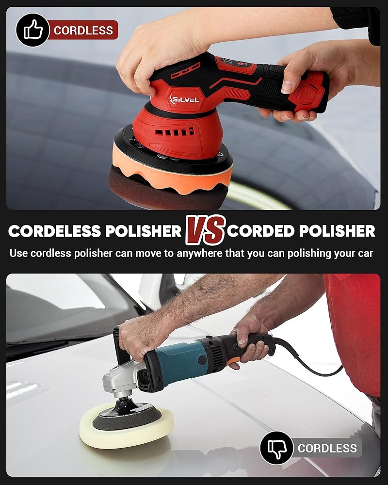 [ملمع مزدوج الحركة لاسلكي] يتميز ببطاريتين قابلتين لإعادة الشحن بقدرة 12 فولت 2000 مللي أمبير في الساعة، مما يسمح لك بتوديع الأسلاك المزعجة. استمتع بالحرية اللاسلكية المطلقة في أي وقت وفي أي مكان.