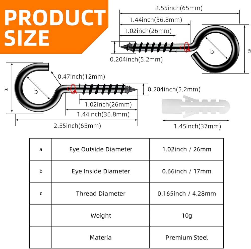 • Package & Size: The total length of our 10 x Opening and 10 x closing black eye screws for wood is 2.55inch(65mm) Smooth and thick frame suitable for outdoor patio with strung lights or anywhere you want