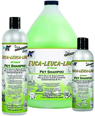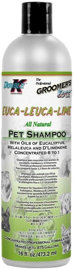 Pesticide-free Groomer?s Edge? Euca-Leuca-Lime Shampoo contains eucalyptus and d-Limonene for effectiveness. Melaleuca alternifolia soothes irritated, insect-bitten skin. Euca-Leuca-Lime Shampoo is safe for use on dogs, cats, puppies and kittens over 6 week old. Leaves a refreshing citrus scent. 16 oz size of shampoo makes 3 quarts.