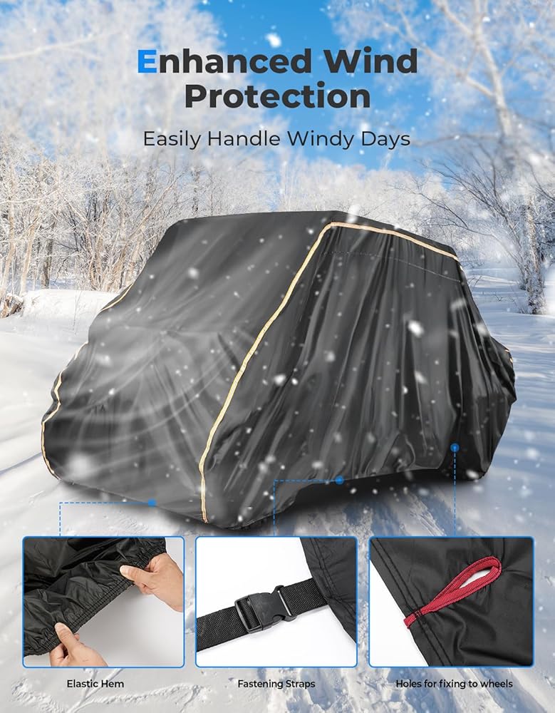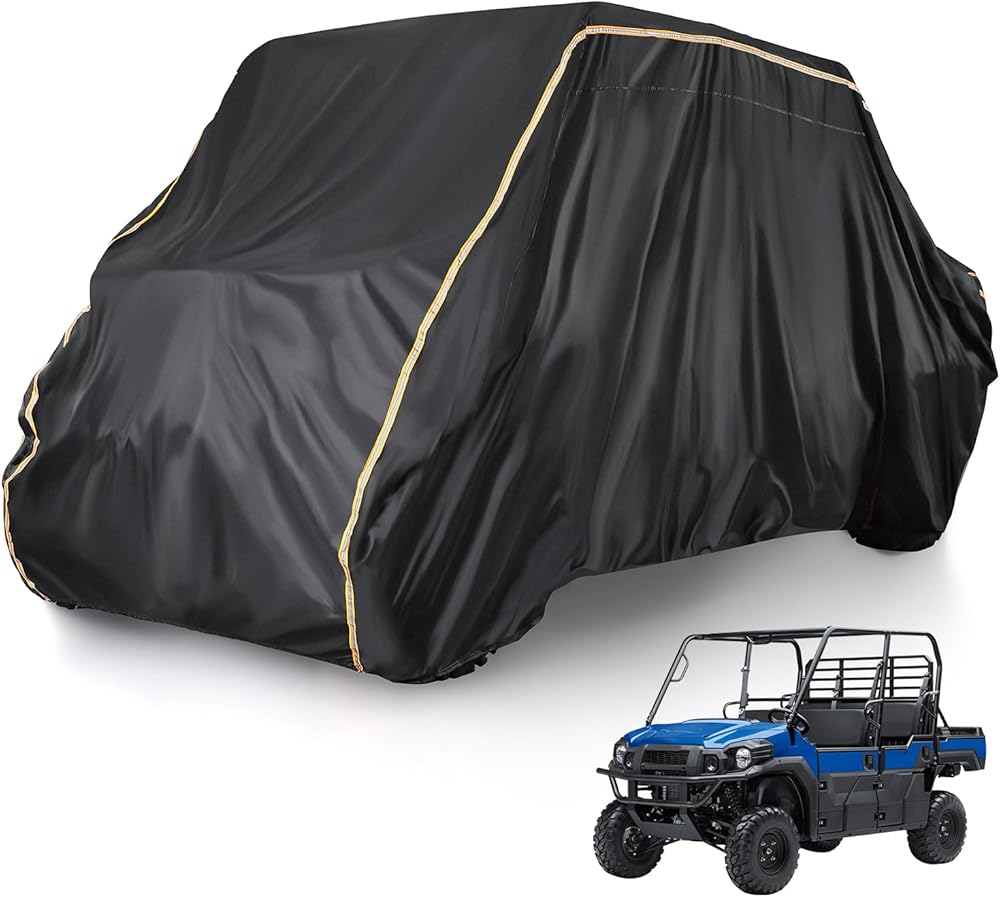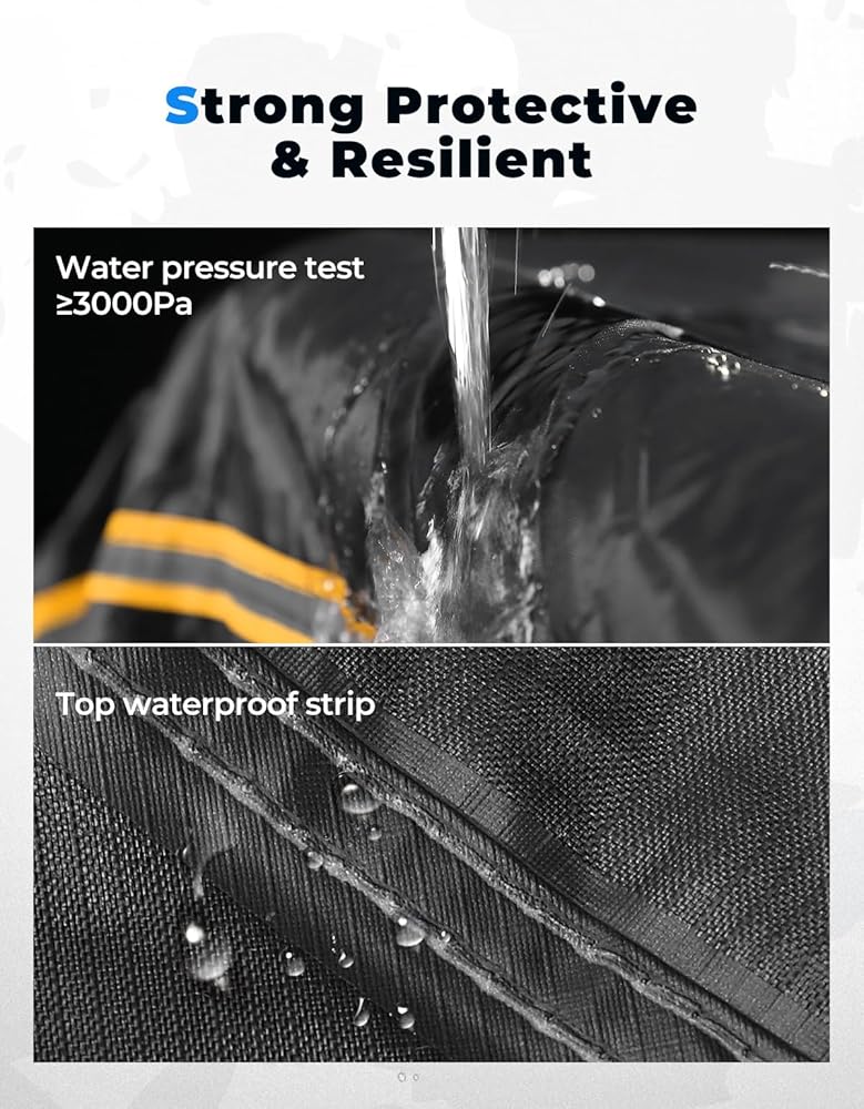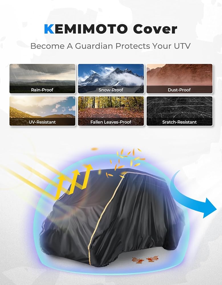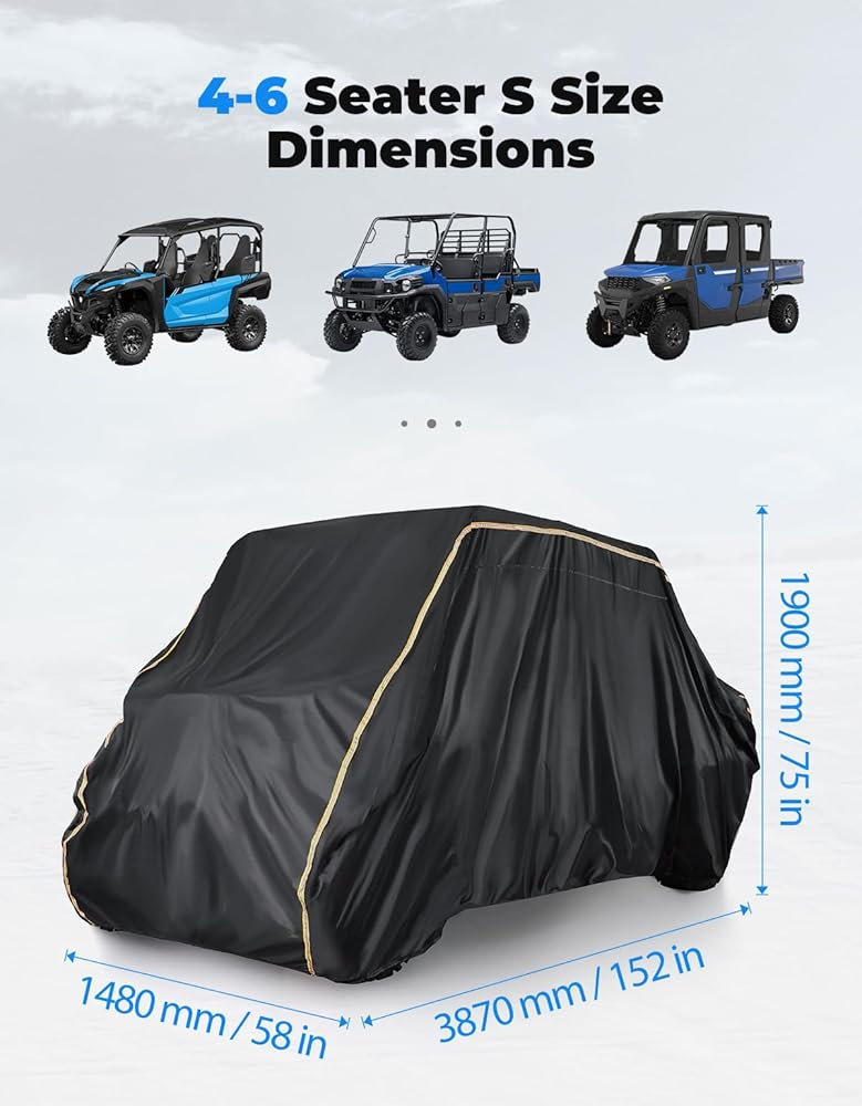 نسيج مقاوم للماء 420D - مصنوع من نسيج 420D قوي يتحمل ضغط الماء حتى 3000 مم، غطاء UTV ذو 4 مقاعد يحمي الجزء الداخلي لسيارتك من المطر، ويحافظ على الجفاف ويمنع الضرر.
