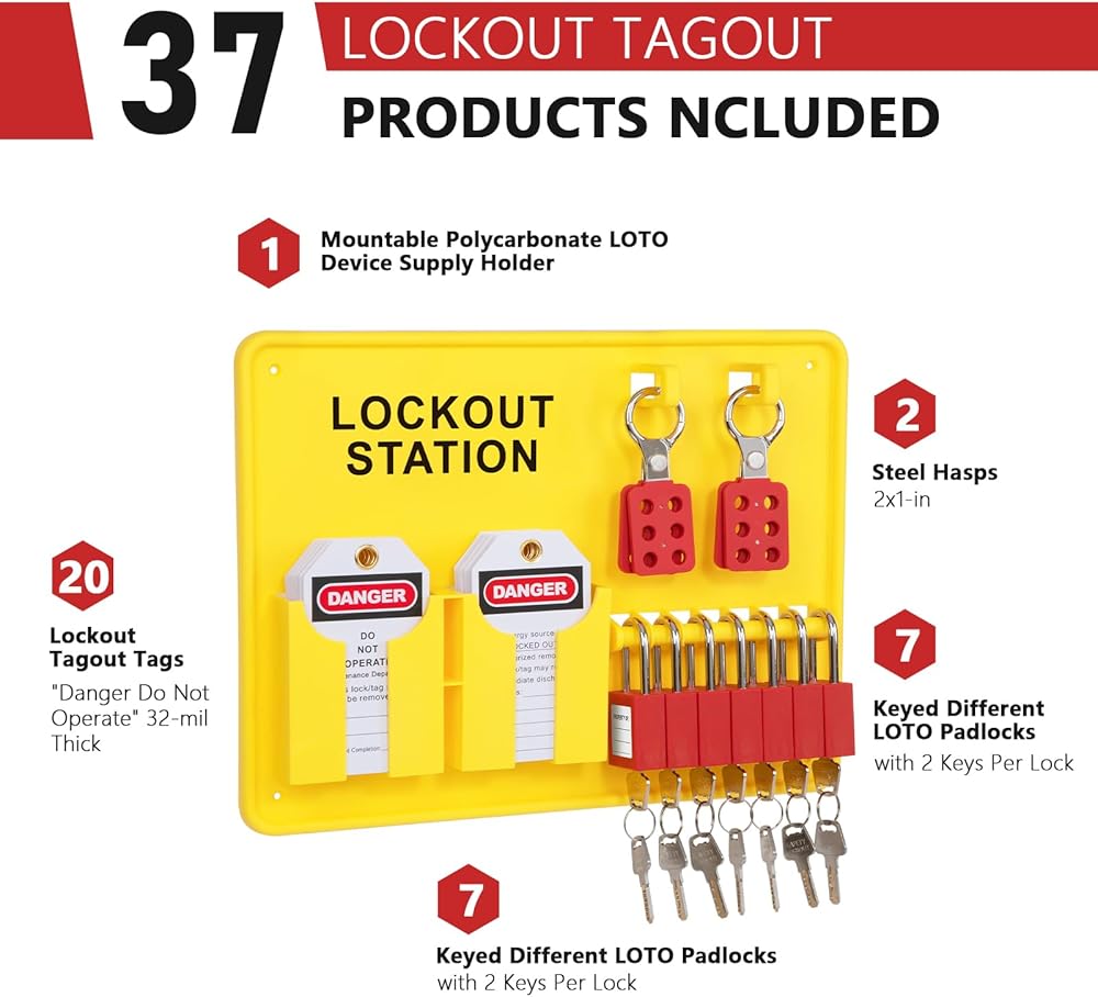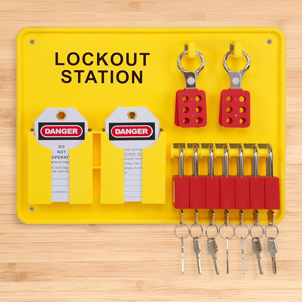محطة Moorovgi Lockout Tagout، لوحة أدوات قفل العلامات مع 7 أقفال أمان، 2 مشابك، 25 لا تعمل على إمداد أمان القفل