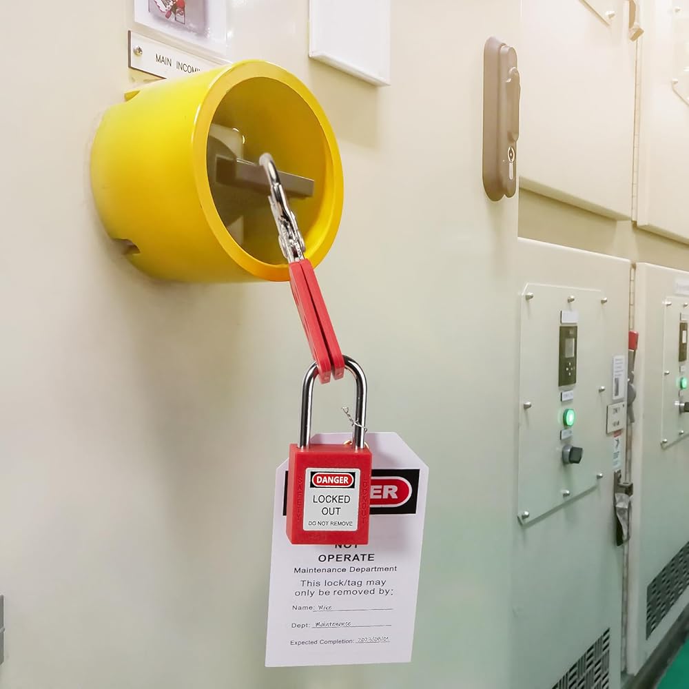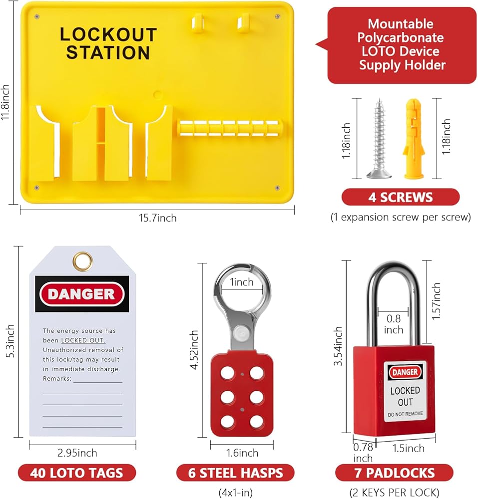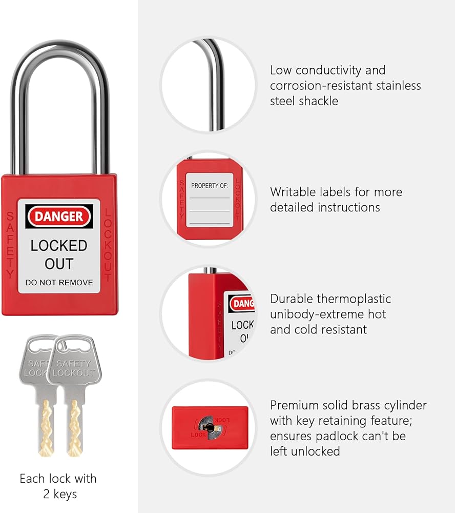• Safety Padlocks:7 red Padlocks, with lock cores made of brass, capable of achieving a 6-level management system, drainage and anti-corrosion design, shell material resistant to acid and alkali, and long service life; The key can be inserted on both sides, and the padlock has anti slip strips on both sides.
