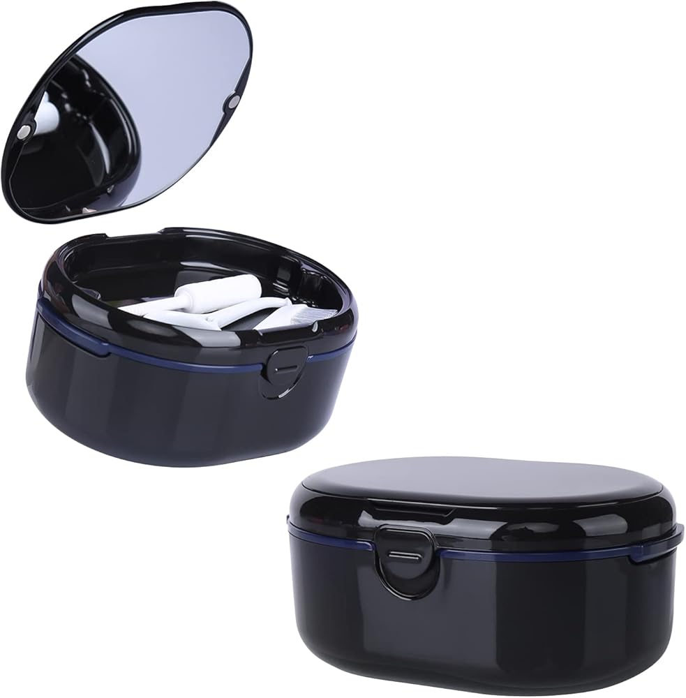 مجموعة أدوات طقم الأسنان، حقيبة تثبيت محمولة مثالية للسفر، حاوية صندوق حمام طقم الأسنان، العناية بتنظيف أطقم الأسنان، واقي الفم مع مصفاة، أداة إزالة ومرآة (أسود)