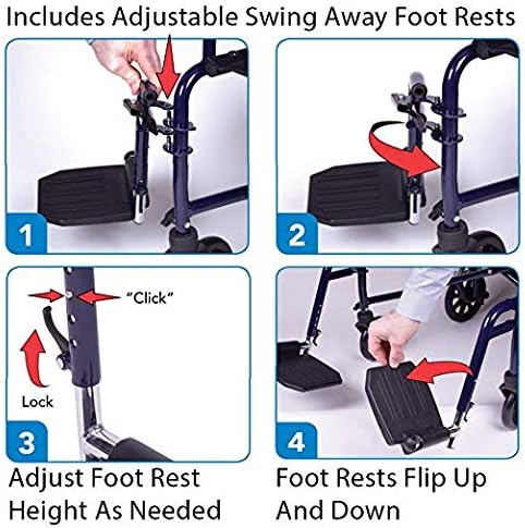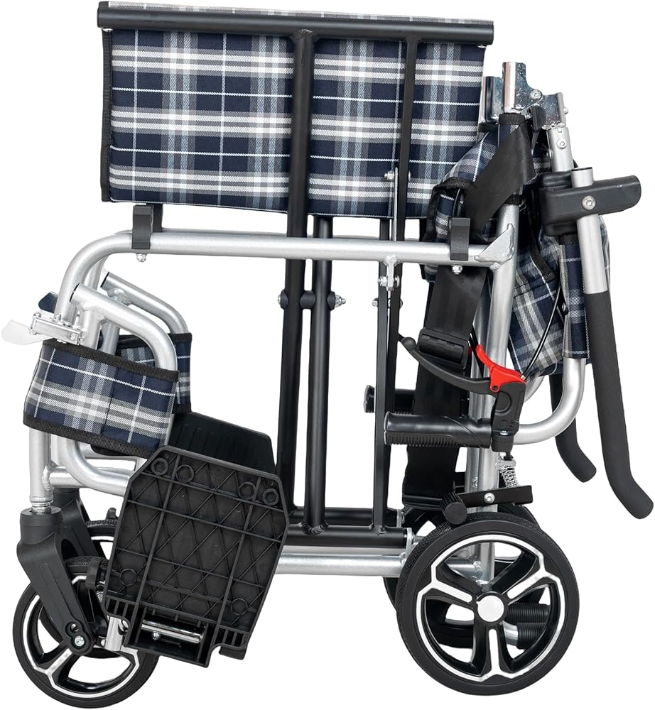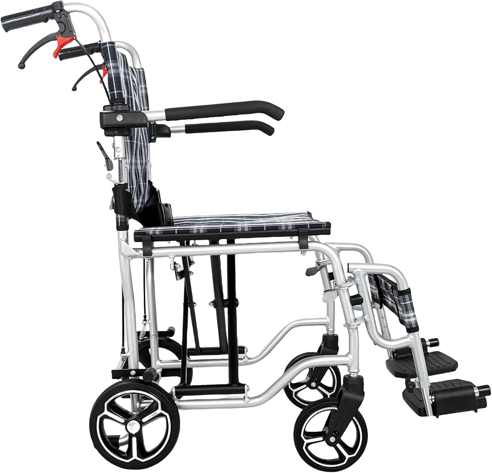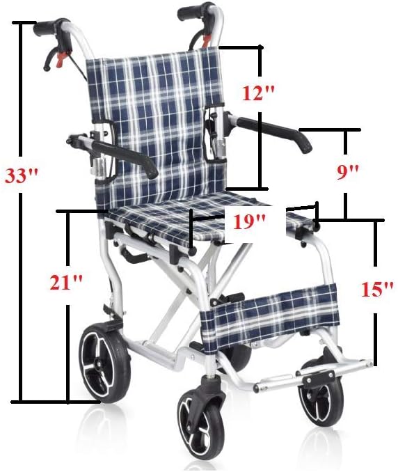 كرسي نقل من الألومنيوم خفيف الوزن بوزن 18 باوند فقط، مسند ذراع كامل مبطن بالفوم ومبطن بمسند ذراع كامل وحزام متأرجح، مزود بحزام أمان. اضغط على حجم العبوة. رائعة لجميع أنواع السفر، ويمكن فحصها بسهولة على متن الطائرة وتحميلها على متن حجرة الشحن، وتشمل حقيبة العناية. سواء في الداخل أو الخارج، على أي سطح. عجلات أمامية صلبة مقاس 5 انش وعجلة خلفية مقاس 8 انش. مسند ظهر قابل للطي مزود بحماية السلامة، فرامل يد مع وظيفة ركن السيارات. بالمقارنة مع الكراسي المتحركة، يتطلب كرسي النقل هيلث لاين مقدم رعاية لدفع الكرسي. كرسي النقل أخف بكثير من الكرسي المتحرك؛ بالإضافة إلى ذلك، فهو أصغر مما يجعل التجول في المدينة أسهل. مواصفات المنتج للكرسي المتحرك: يمكن طيها إلى مساحة صغيرة 26 انش × 11 انش × 26 انش، تناسب بسهولة معظم السيارات أو التخزين. لا توجد أدوات ولا تحتاج إلى تجميع تقريبًا. مقعد مريح عريض للغاية (19 انش عرض × 16 انش عمق) ارتفاع المقعد 21 انش، وزن المنتج: 18 باوند، سعة الوزن: 225 باوند