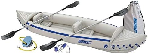 The Sea Eagle 370 kayak with Deluxe Package features the SE370 Hull, 2 AB 30 4 Part Paddles, 2 SEC Seats, A 41 Foot Pump, & Nylon Carry Bag. This is extremely durable, lightweight (32 pounds), and perfect for all your adventures on the water. This instant Sea Eagle 370 kayak is very stable and can be launched anywhere and can easily travel in the trunk of your car or on an airplane! With 2 skegs the SE370 kayak has excellent tracking. It is no wonder the Sea Eagle 370 is the most popular inflatable kayak in America! This kayak features a sun and saltwater resistant hull material, is pet friendly and tough, and comes with a 3 year.