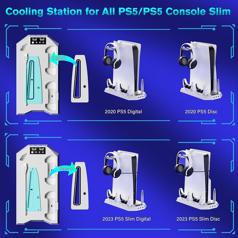 【متوافقة مع وحدات التحكم PS5/PS5 Slim】 محطة التبريد هذه متوافقة مع وحدات التحكم PS5 Slim Disc/Digital وPS5 Disc/Digital، مما يضمن عدم وجود مشكلات في التوافق. يتم تضمين تعليمات مفصلة لتوجيه التثبيت. لا توجد خطوات تركيب معقدة ويمكنك الحصول على هذا الحامل.