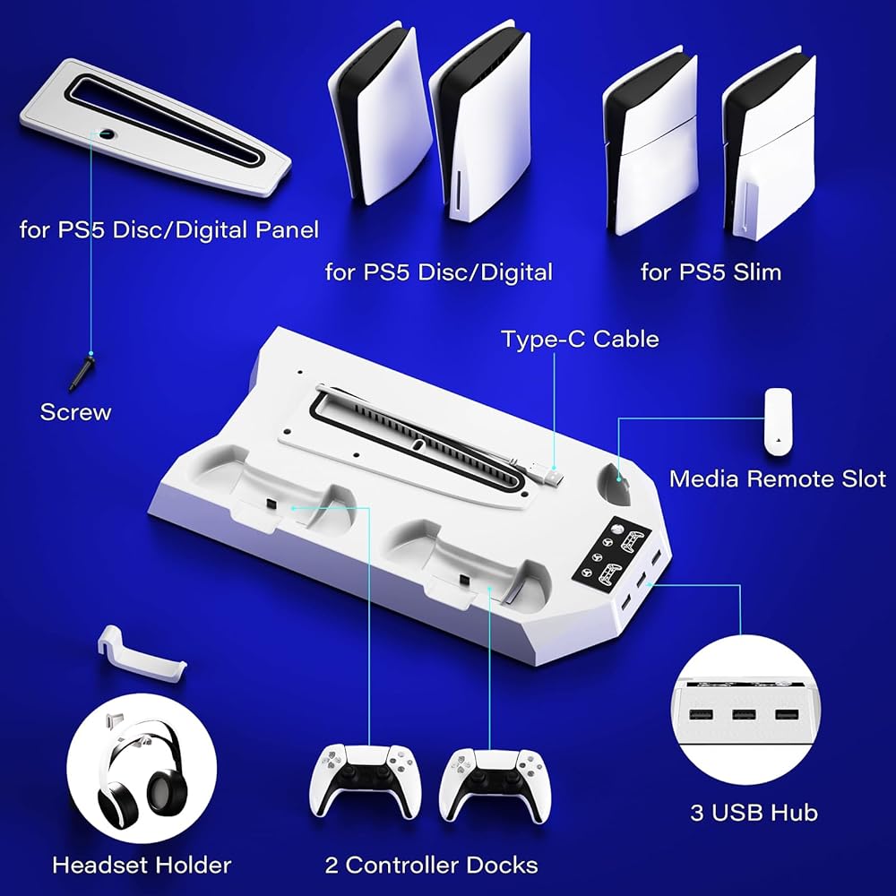 حامل تبريد متوافق مع PS5، محطة تبريد لجهاز PS5 وPS5 Slim Console Disc/الإصدار الرقمي، محطة شحن مع شاحن وحدة تحكم مزدوجة، مروحة تبريد 3 مستويات، 3 محاور USB وحامل سماعة الرأس