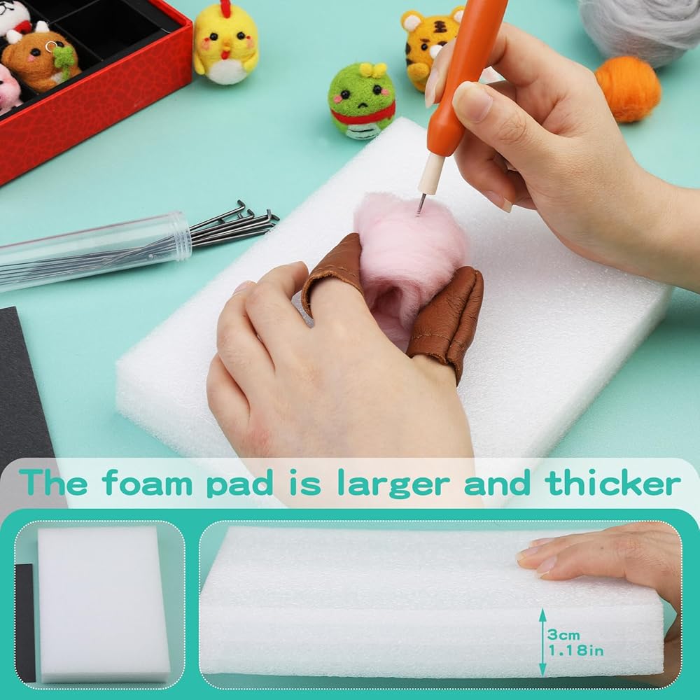 ❣المزيد من أدوات اللباد بالإبرة لتلبية احتياجاتك - تحتوي مجموعة لباد الصوف هذه على 15 إبرة لباد صوف، ومقبض خشبي لإبرة اللباد البرتقالية، ومجموعة واحدة من مهود الأصابع الجلدية بألوان عشوائية، ووسادة إسفنجية واحدة بطول 20 سم وعرض 15 سم، ووسادة إسفنجية بسُمك 3 سم، والتي يمكن أن تمنع بشكل فعال الخدوش على سطح المكتب الناجمة عن إبر التلبيد. جميع الأدوات المذكورة أعلاه تأتي في صندوق هدايا جميل، سهل الحمل والتخزين، ويمكنك أيضًا تقديمها لأصدقائك كهدية عيد الميلاد.