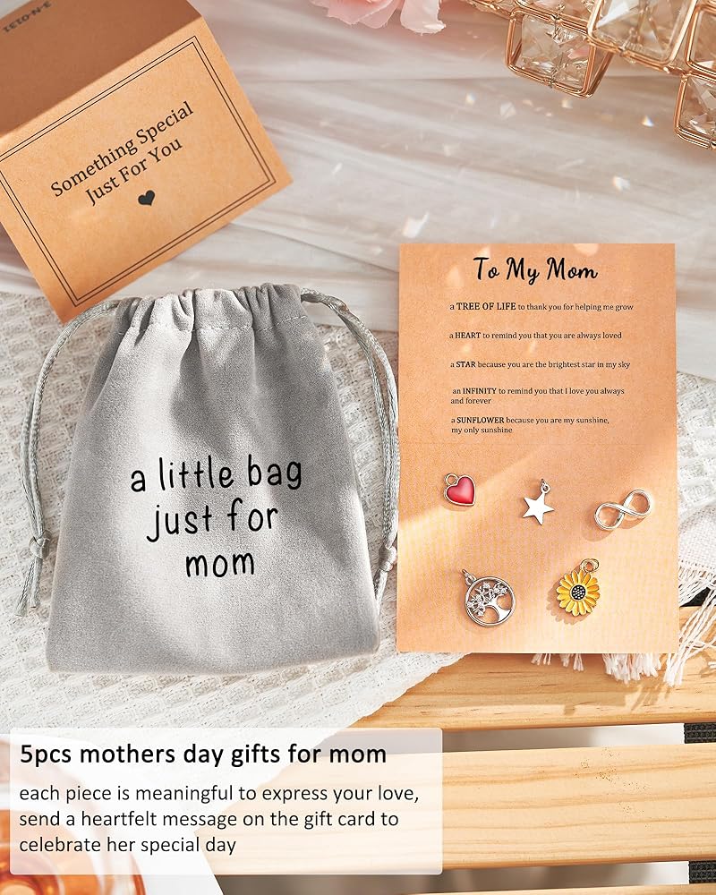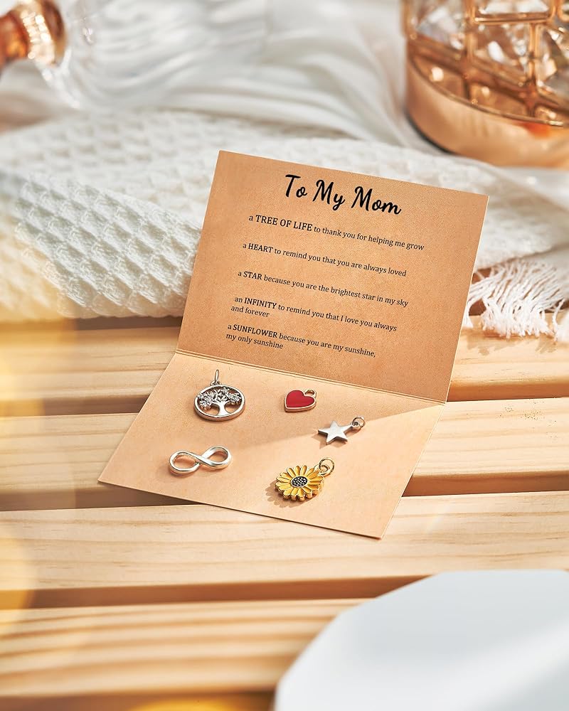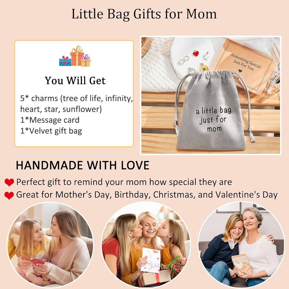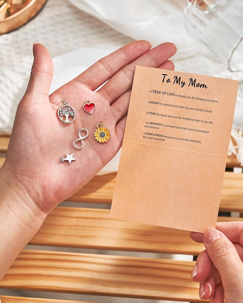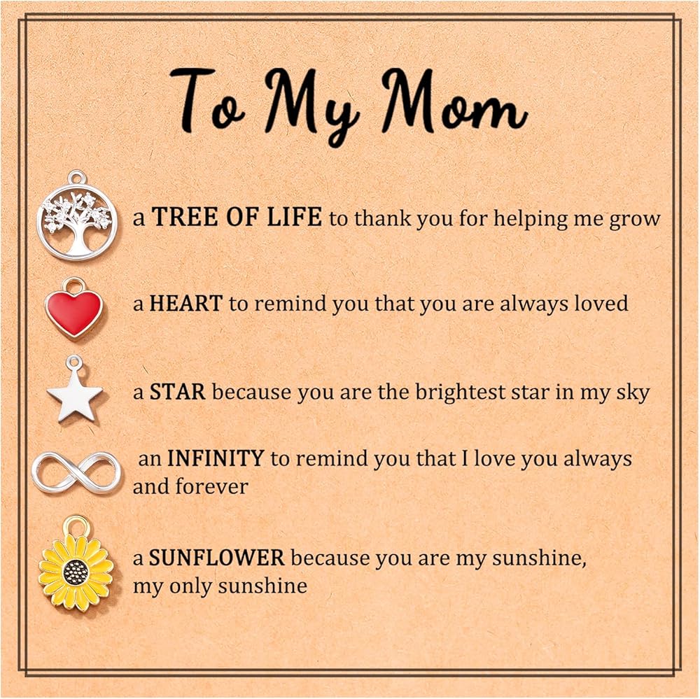5PCS MOTHERS DAY GIFTS FOR MOM - Each little bag contains a charm of a tree of life, a heart, a star, an infinity, and a sunflower, each piece is meaningful to express your love, send a heartfelt message on the gift card to celebrate her special day
