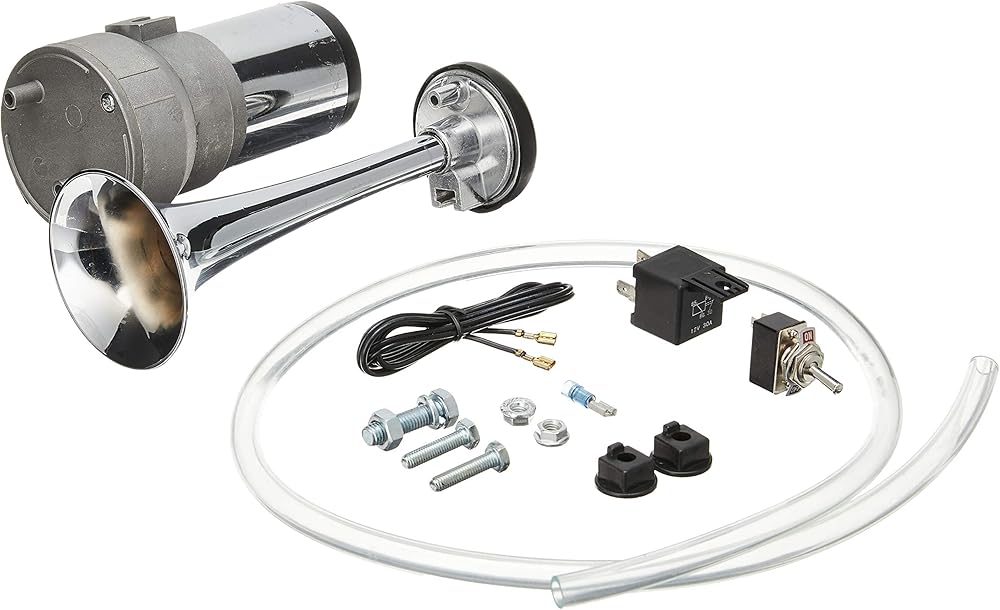 The Wolo 416 is a super loud, air powered two tone horn. With the throw of a switch you can change the sound of the horn from a “Steady Blast” to a “Euro Emergency Vehicle HI/LO” sound. The two (2) trumpets are metal, chrome plated and will look great in any engine compartment. Comes with a heavy-duty compressor, 30-amp relay, hose, toggle switch and mounting hardware. Instructions in English / Spanish.
