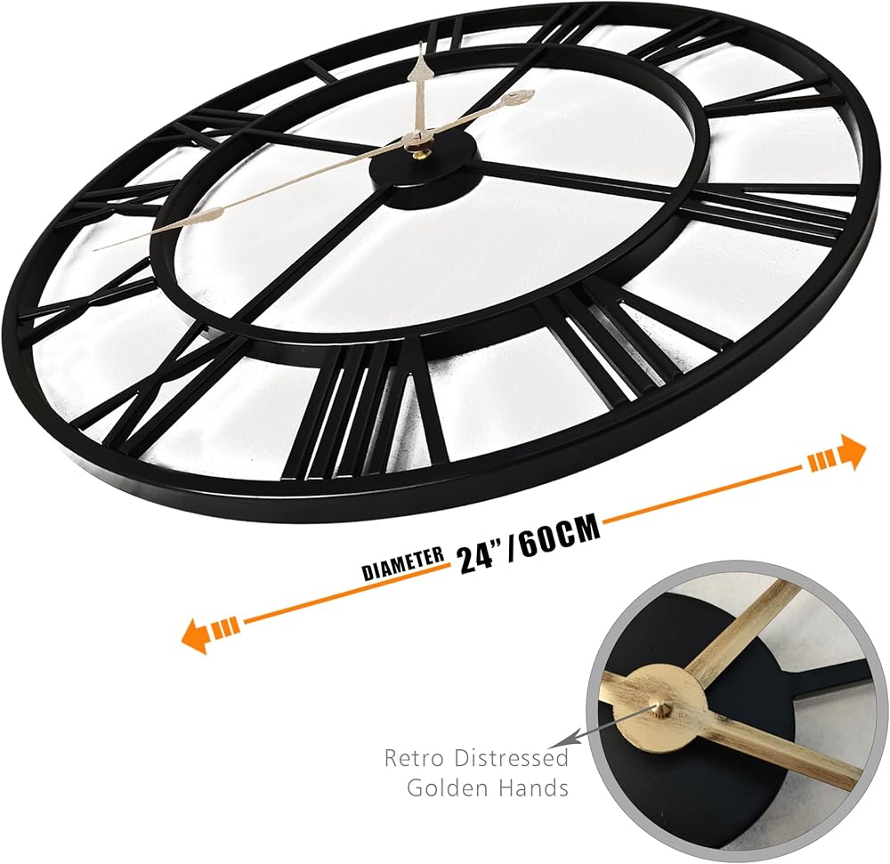 ساعة حائط معدنية كبيرة بسمك 24 بوصة، ساعات صناعية لتزيين المنزل بأرقام رومانية كبيرة، ساعة كبيرة الحجم لديكور غرفة المعيشة، تعمل بالبطارية (أسود روماني)