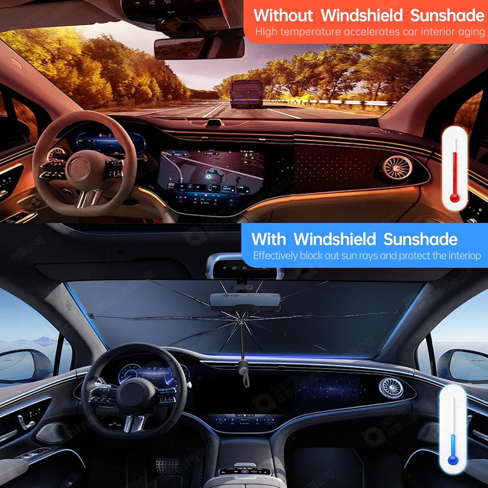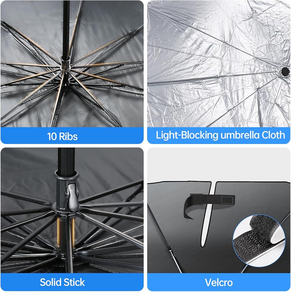 【استخدم مواد عالية الجودة】--تم تصميم مظلة السيارة بعمود معدني أسود مطلي بالكروم ثلاثي الطيات وإطار معدني قوي. تصميم المقبض المريح يزيد من الراحة ويحافظ على السلامة. يضمن الإطار القوي والدعم المستقر متانة مظلة السيارة هذه. حافظ على سيارتك في حالة باردة ومريحة في أيام الصيف الحارة.