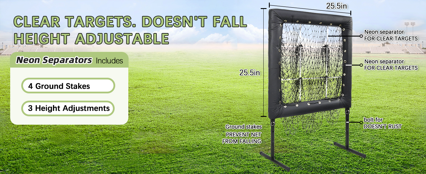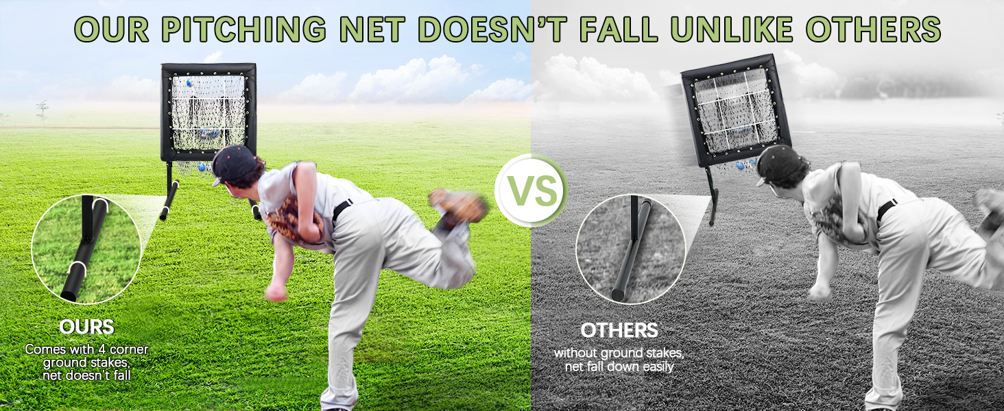 • [محمول وتجميع] شبكة ضرب البيسبول سهلة التجميع للغاية. ما عليك سوى وضع الإطار في الأرجل وقفله بالمزالج. تأتي مع 4 أوتاد أرضية على شكل حرف U، تقاوم درجة السرعة العالية وتمنع السقوط.