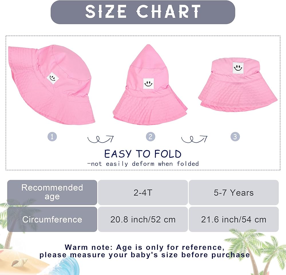Size information: the kid's bucket hat wide brim beach hats come in 2 various sizes, 20.8 inches for a 2-4-year-old and 21.6 inches for a 5-7-year-old; you can carefully compare the age and size charts and choose the right size