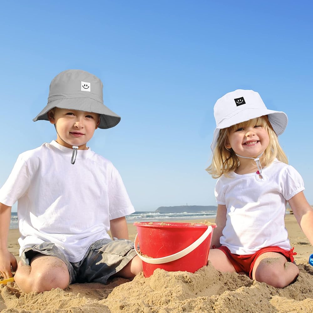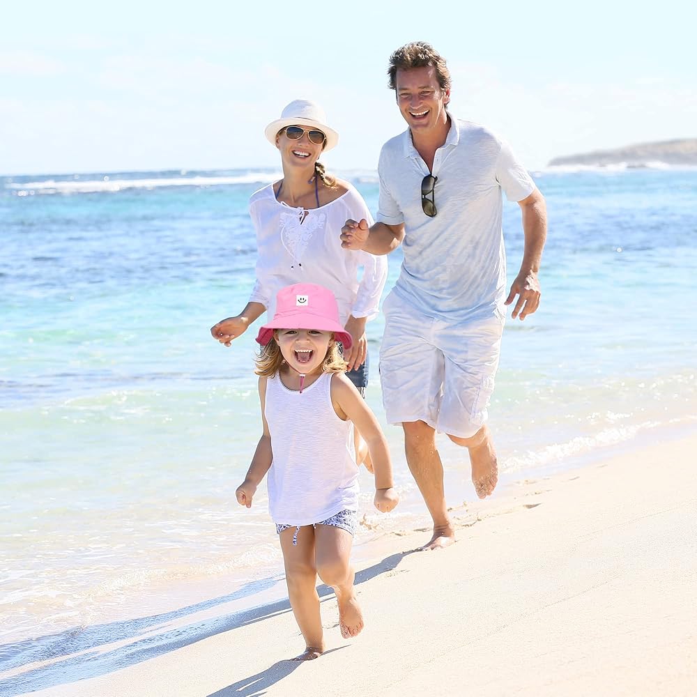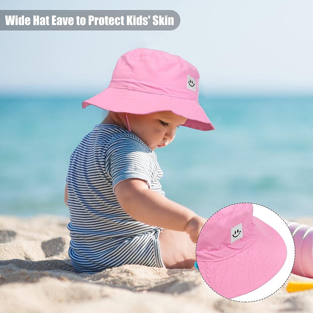 Adjustable bucket design: our children's beach hat has an adjustable headband at the back that tights or loosens around the head, it also has a chin strap that stays firmly on the child's head, to keep the sun hat from blowing off on windy days, allowing children to enjoy summer!