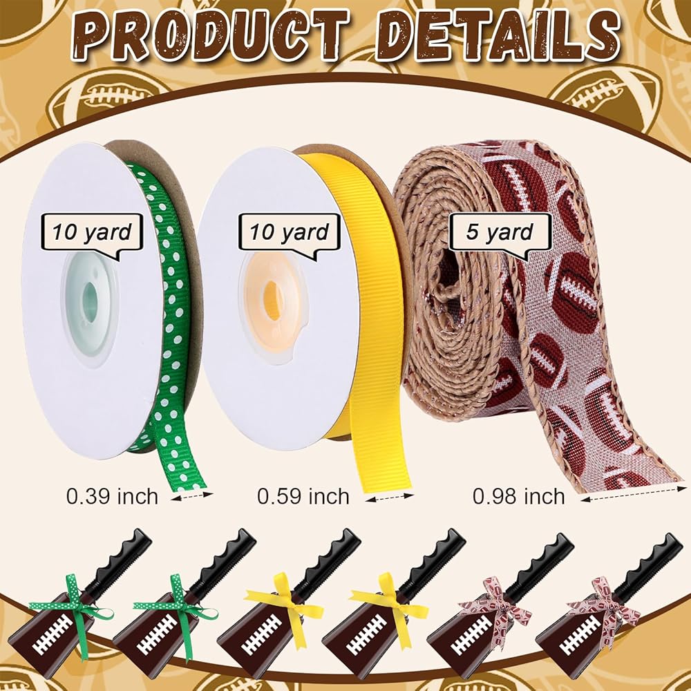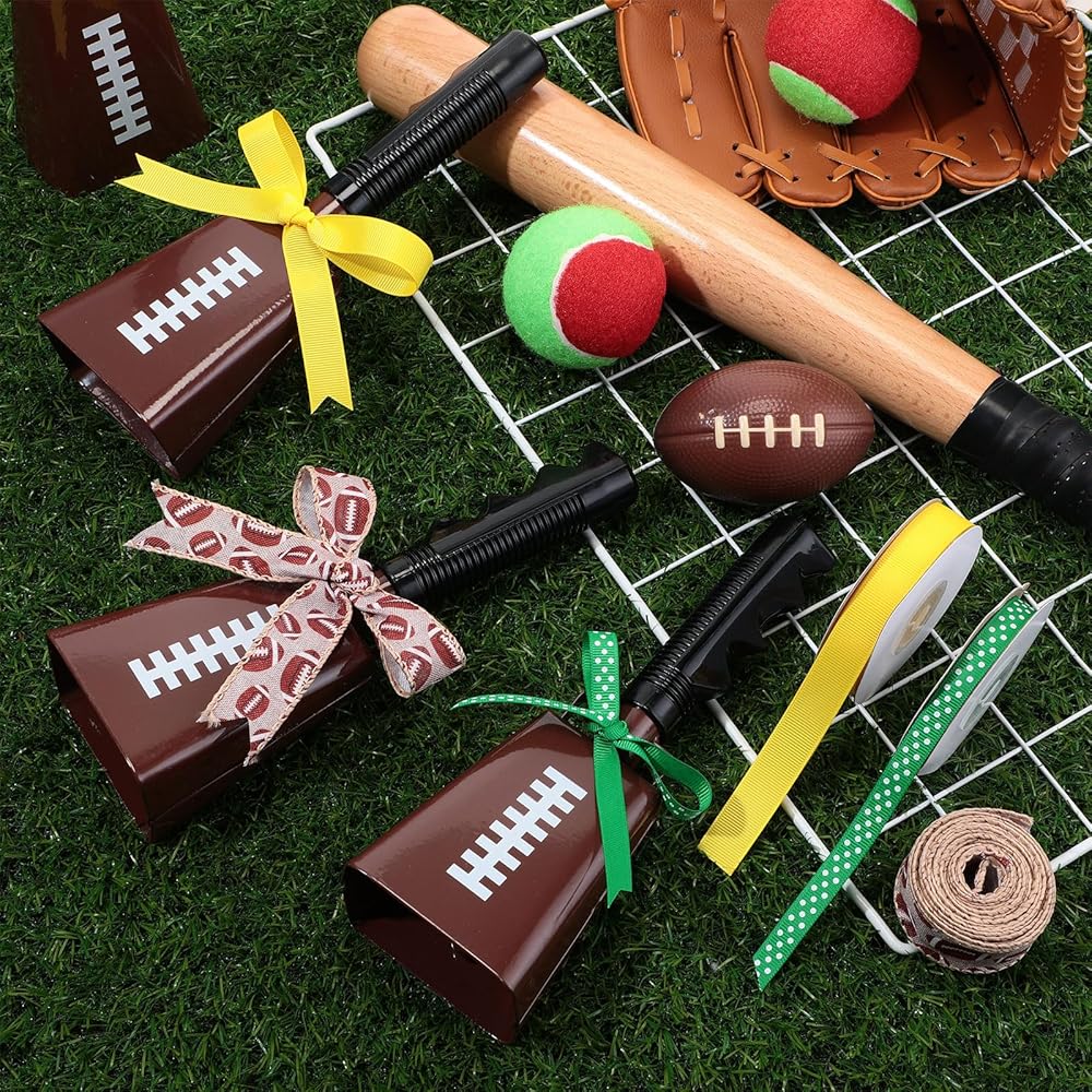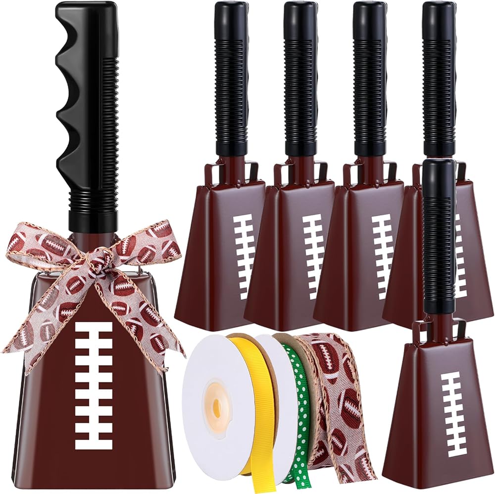 • Complete Package for a Football Game Bell: with your purchase, you receive 6 hand percussion cowbells and 3 different rolls of ribbons; This includes a green ribbon with white dots, a solid yellow ribbon, and an overlay ribbon printed with a football pattern