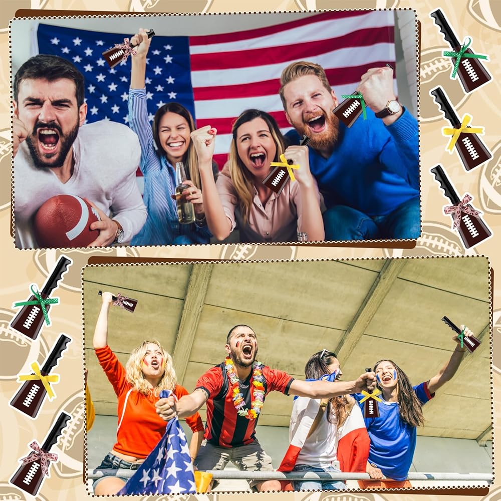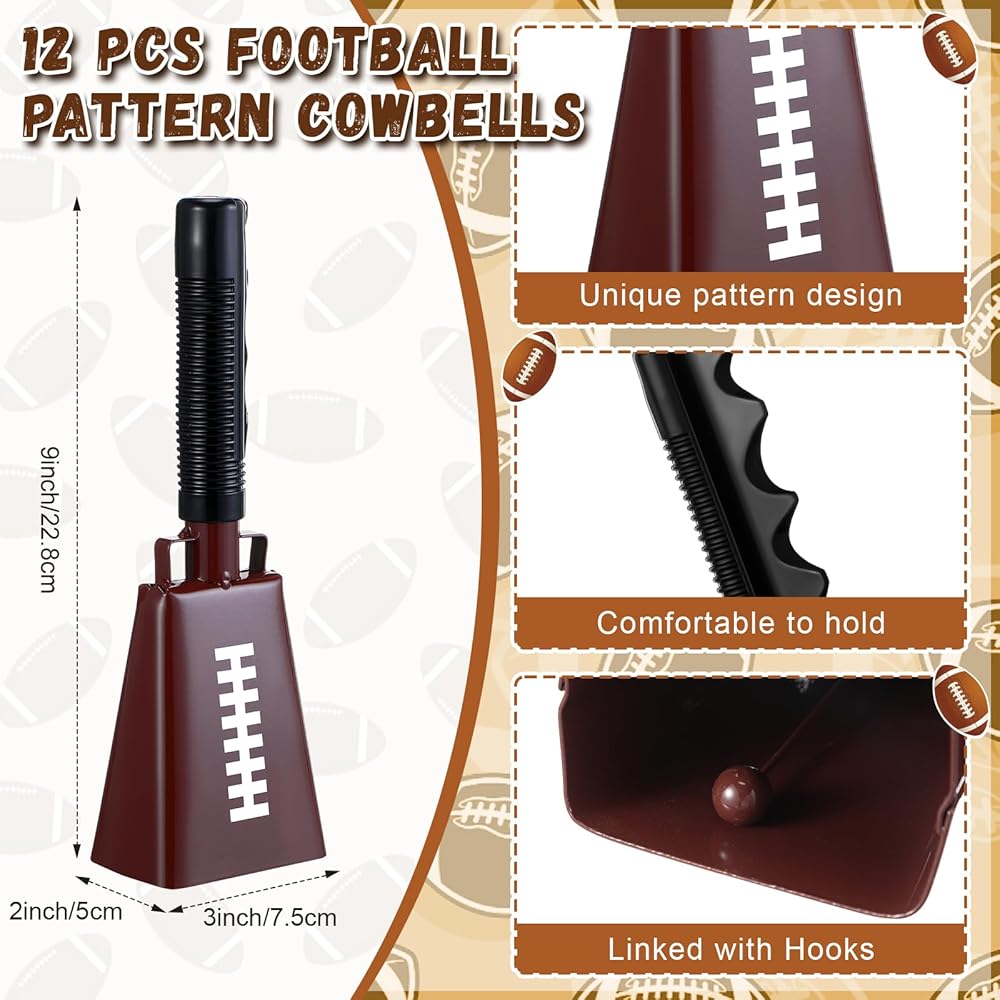• Football Themed Design for Sports Enthusiasts: these cow bells for football games are designed with a distinct football pattern on its surface, beautifully articulating your love for the sport; It's an ideal tool to amp up the excitement at celebrations, competition, and matches, helping you express your team spirit effectively