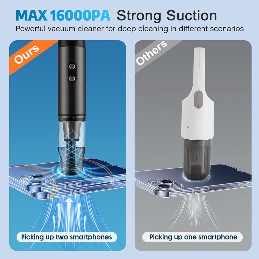 قوة شفط فائقة 16 كيلو باسكال مع أوضاع مزدوجة: توفر المكنسة الكهربائية الصغيرة المحمولة للسيارة (أسبرادورا بارا كارو) وضعين للشفط. قوة الشفط القصوى التي تبلغ 16,000 باسكال تمكنه من التقاط الجزيئات الصلبة والحطام بسهولة، حتى أنه قادر على رفع هاتفين ذكيين. يعتبر وضع الطاقة القياسي الذي تبلغ قوته 8000 باسكال مثاليًا لامتصاص الغبار. حافظ على سيارتك نظيفة وجديدة في جميع الأوقات.
