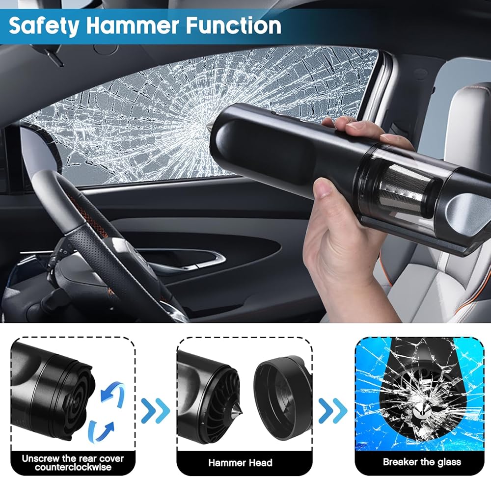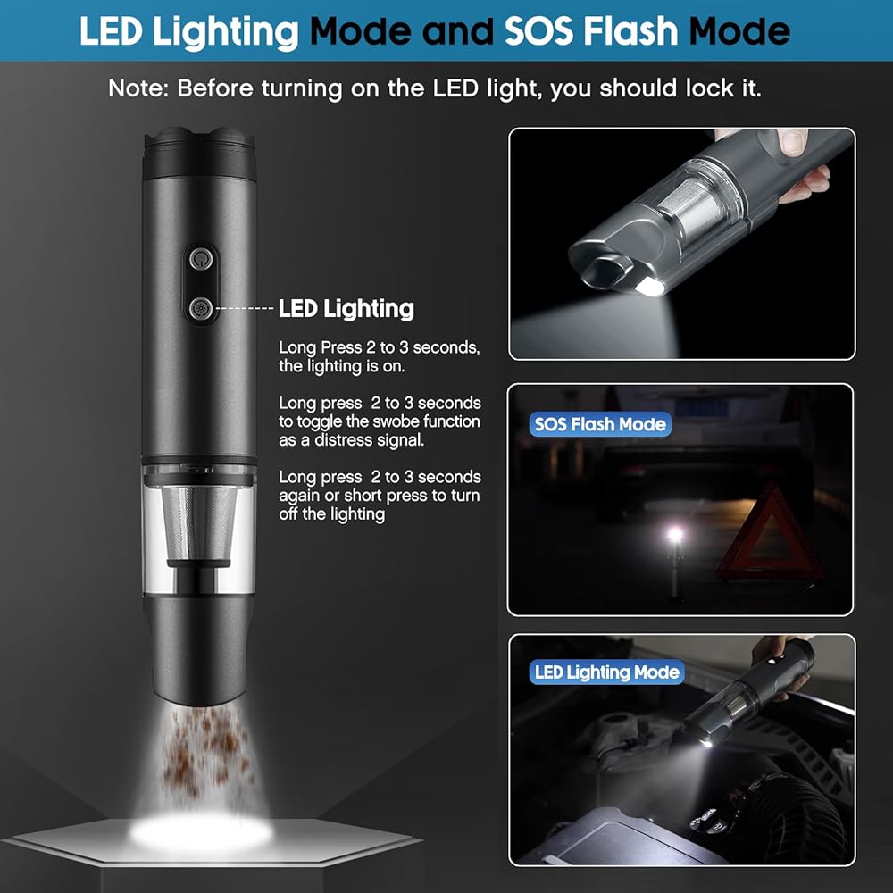【مطرقة أمان مدمجة، ومصباح LED وتنبيه SOS】تم تجهيز المكنسة الكهربائية المحمولة للسيارة بمطرقة أمان مدمجة، ومصباح LED، ومنبه LED SOS. يضمن مصباح LED رؤية واضحة في المناطق ذات الإضاءة الخافتة، بينما يمكن استخدام ضوء الطوارئ SOS في أي حالات طوارئ مفاجئة على جانب الطريق. سافر براحة البال مع العلم أن لديك هذه الميزات الأساسية في متناول اليد.