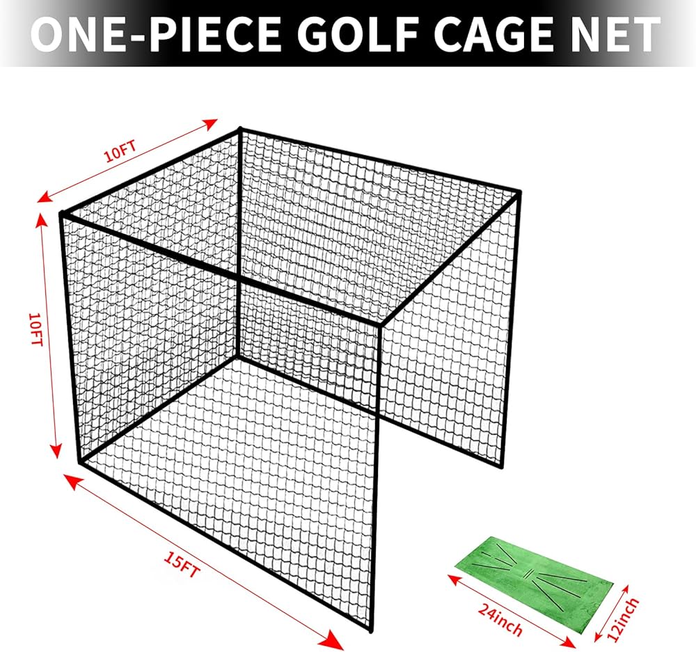 One-piece Golf Cage Net: Knotless mesh construction, 3mm polyester cord diameter, 3/4" mesh square mesh and 7mm reinforced border, the size is 10 x 10 x 15ft (W*H*D). Not include the poles or frame fittings.
