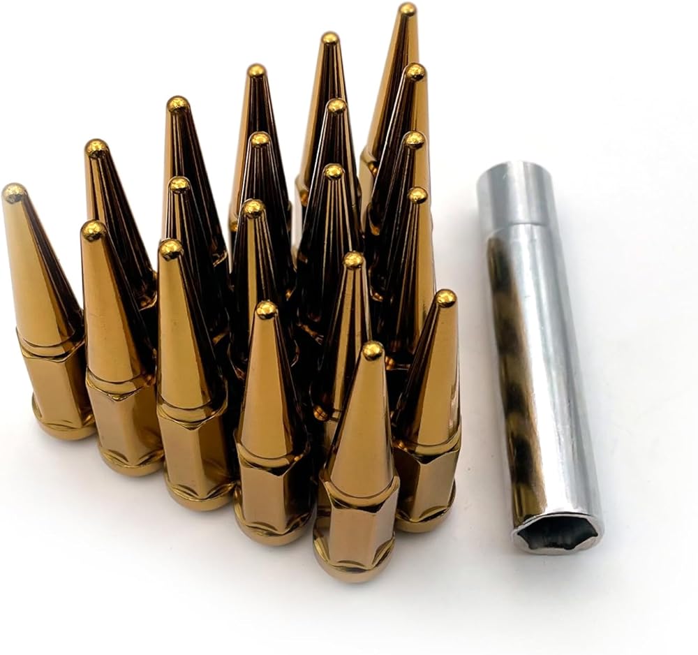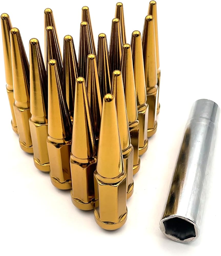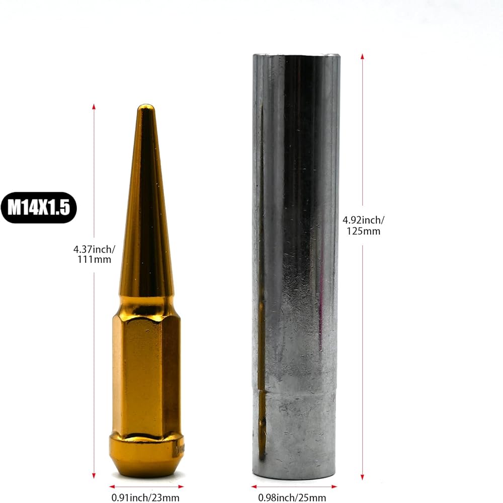 LJAUTOJK M14x1.5 صواميل العروة المدببة، 20 قطعة من صواميل العجلات المضادة للسرقة، مقعد مخروطي/مخروطي، صواميل نهاية مغلقة ذهبية مع مفتاح مقبس واحد لعجلة ما بعد البيع تشيفي سيلفرادو