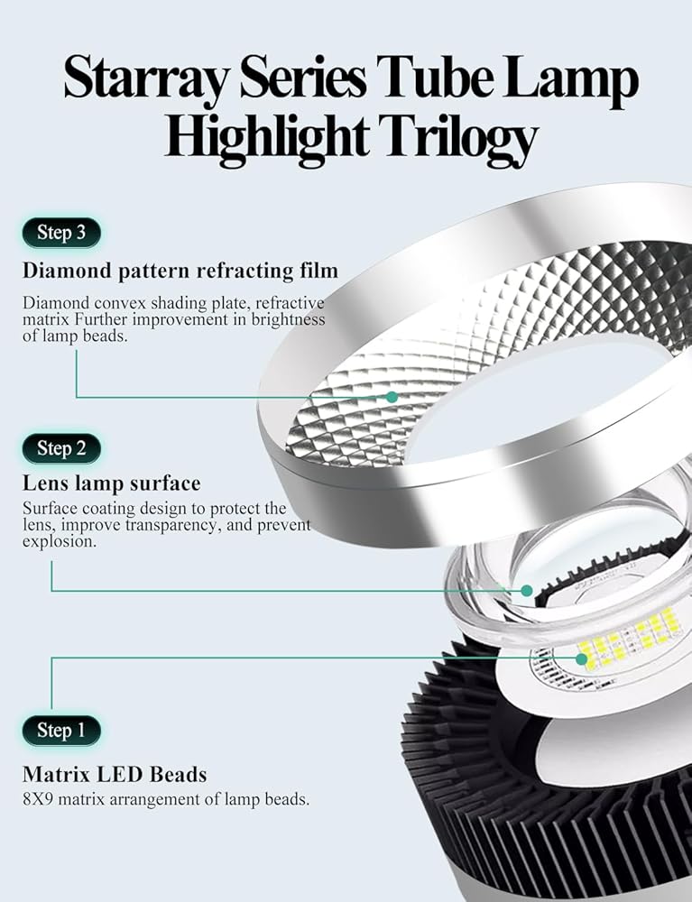 【تبديد فعال للحرارة】تبديد الحرارة بواسطة مروحة تقليل الضوضاء، نظام تبريد هواء المبرد من سبائك الألومنيوم المتكامل، تصميم أخدود تبديد حرارة زعنفة حلقية 360 درجة، مما يزيد بشكل كبير من منطقة تبديد الحرارة، ويقلل بشكل فعال من توهين الضوء، ويكون متينًا. محول الطاقة آمن للاستخدام وموفر للطاقة.