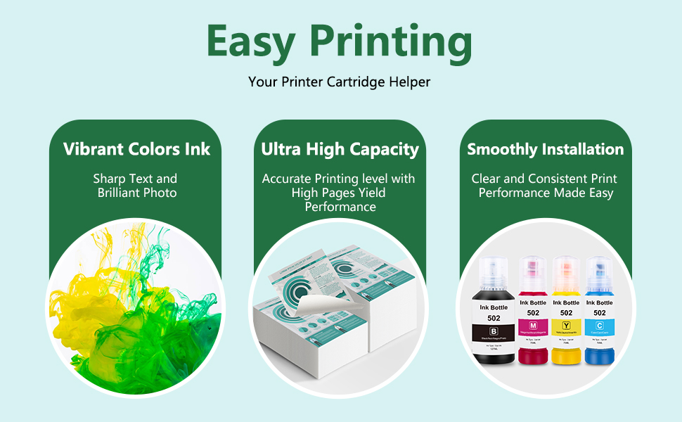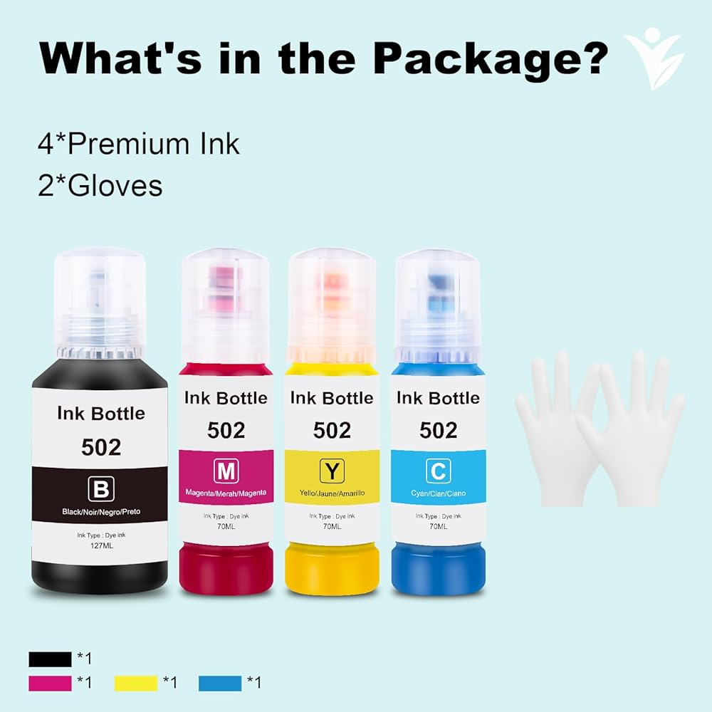 تصميم مثالي: زجاجات الحبر T502 502 مع حبر إيقاف تلقائي بتصميم ملائم تمامًا، بدون انسكاب، تعبئة سهلة، وتبقى باردة، تساعدك على الطباعة بسهولة، وتعمل كما يفعل صانع المعدات الأصلية (ليس حبر التسامي)