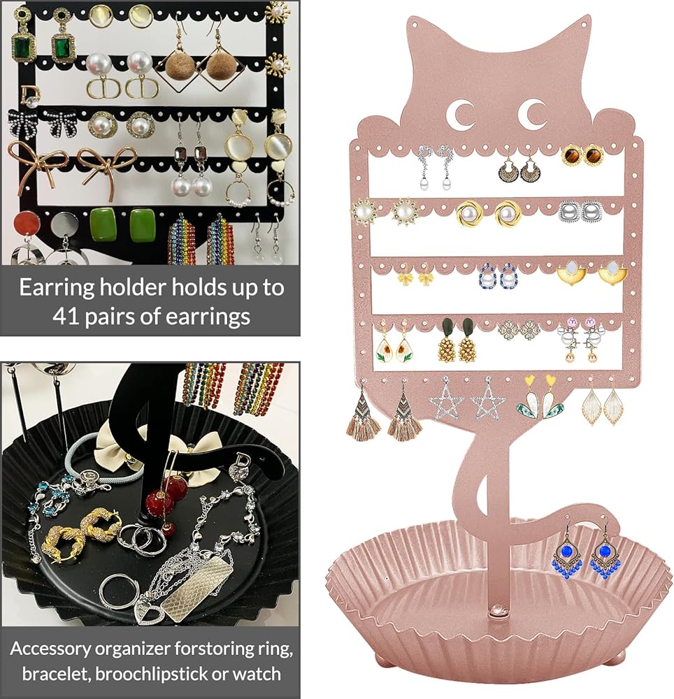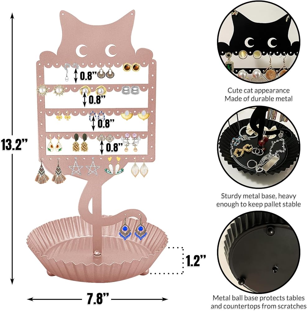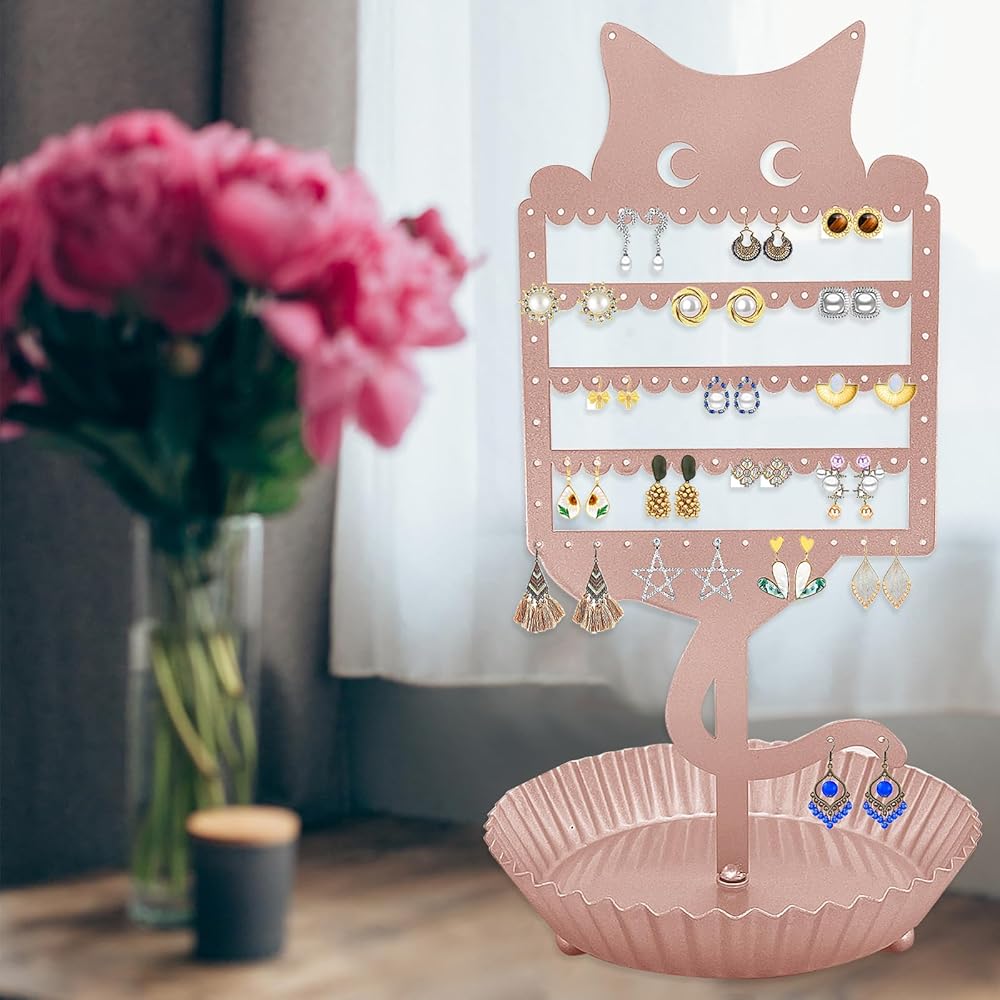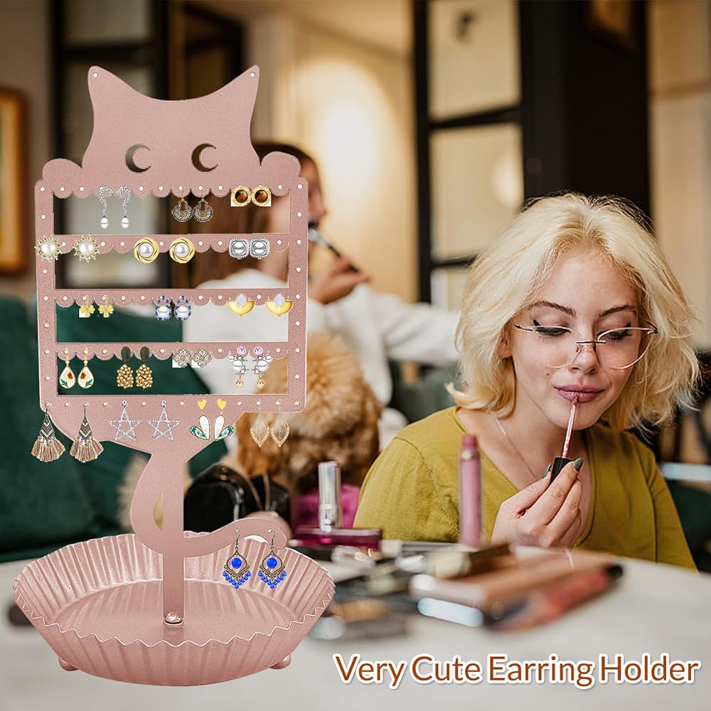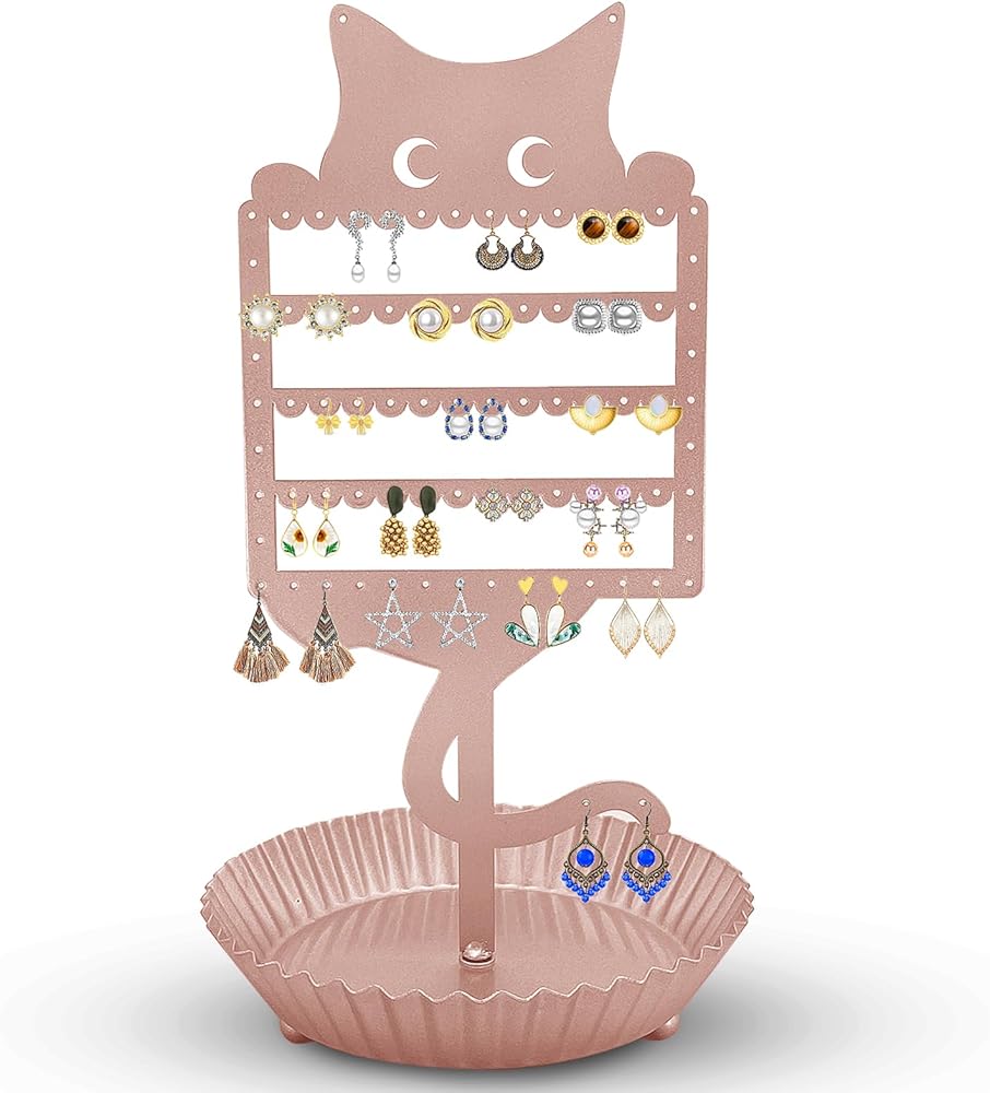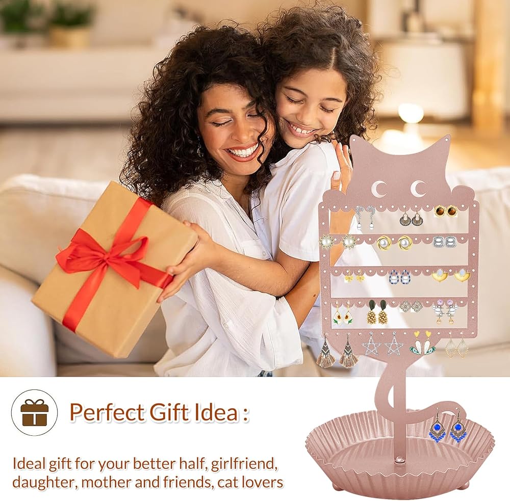 حامل أقراط لطيف: قم بتنظيم وعرض مجموعة الأقراط الخاصة بك مع منظم الأقراط على شكل قطة. يوفر لك تصميم حامل الأقراط هذا إمكانية الوصول بسهولة إلى الأقراط والخواتم والقلائد والأساور، مما يزيل التشابك ويسمح لك بالحصول على ما تحتاجه دون الحاجة إلى إزالة جميع العناصر الخاصة بك من الشاشة. يُعد حامل المجوهرات الفريد والأنيق هذا هدية لطيفة لمحبي القطط من جميع الأعمار.