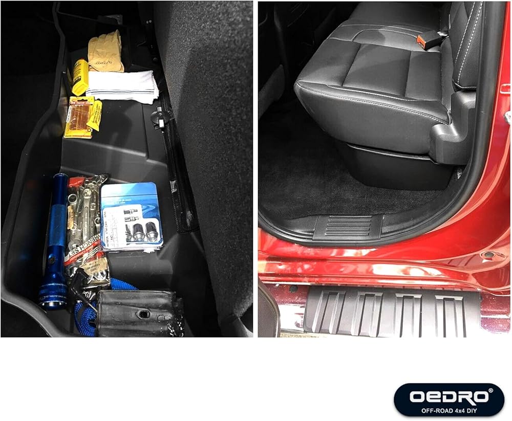 تصميم فريد من نوعه - صندوق تروس تحت المقعد يناسب شاحنتك بدقة ويوفر سعة تخزين كبيرة مع صندوق صغير إضافي. مساحة تخزين رائعة للشاحنة (على سبيل المثال: البندقية، الثلج، فرشاة الثلج، الذخيرة، وصلة البطارية، الأدوات، إلخ.). وتسهل الفواصل تخزين أي عنصر في الشاحنة، دون حدوث أي ضوضاء.