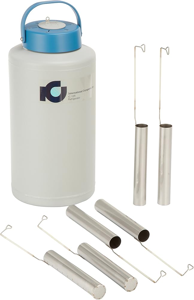 Refrigerator has a hinged, lockable, transparent top for viewing and protecting container contents. Efficient necktube insert maintains thermal performance. A large necktube opening allows the use of canisters that hold 30-40 percent more material. A high strength aluminum shell provides durability. Thermal barrier, advanced insulation and vacuum provide optimum thermal efficiency. There is also a slotted, numbered indexing handle assembly. Specimen storage canisters are provided with each refrigerator. An optional universal roller base is available. Includes 6 storage canisters. 10 liters capacity. Static hold time: 100 days. Evaporation rate: 0.10 liters/ per day. Working time: 62 days/9 weeks. 2.25" Necktube diameter. 11.25" Outside diameter. 23" Overall height. Empty weight: 12 lbs. Full weight: 33 lbs. 11" Canister length. 1.75" Canister inside diameter.