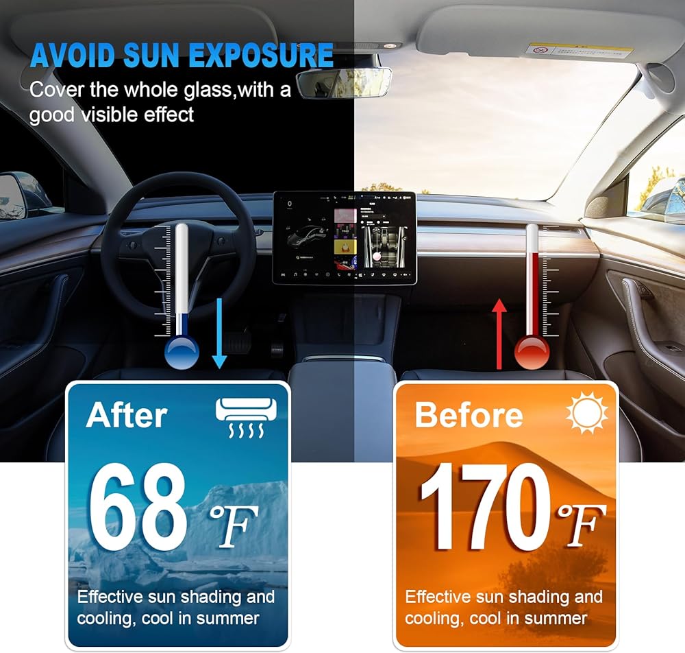 ✔️【قابل للتطبيق على نطاق واسع - يناسب معظم المركبات وطراز تيسلا 3/Y】حجم الزجاج الأمامي لمظلة الشمس للسيارة RUILIXIN هو 52 بوصة × 27 بوصة، مناسب لطراز تيسلا 3، تيسلا موديل Y، السيارة المدمجة، السيدان، سيارات الدفع الرباعي، الميني فان، الشاحنة، سيارة الأعمال، MPV، وما إلى ذلك. يحجب 99.99% من الحرارة ويوفر حماية من الأشعة فوق البنفسجية. ينطبق على مدار السنة.