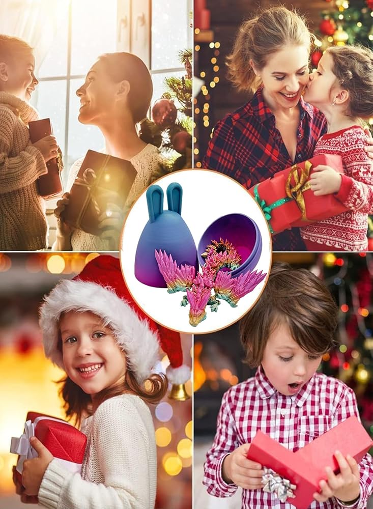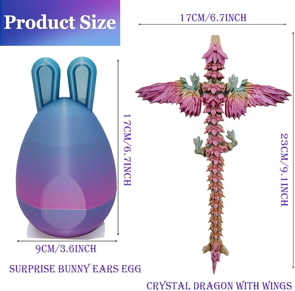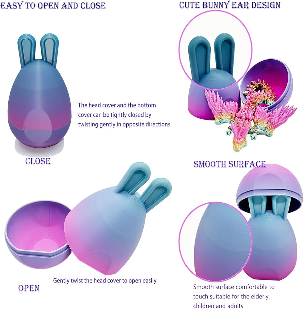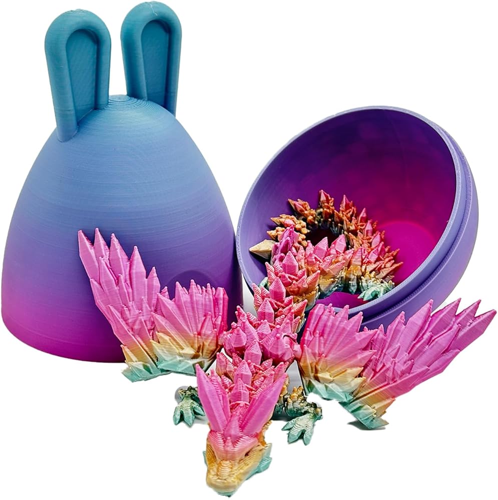 3D Printed Dragon in Egg with Wing --- A pair of cute bunny ears on the gradient color egg look very interesting and dragon eggs with dragon inside add to the happy atmosphere. Fully hinged crystal dragon is also 3D printed design, and the dragon body has a pair of wings,Wings can be retracted and extended, 3D printed articulated crystal dragon can be bent at will. It can be in all kinds of poses, lifelike, like a real dragon. Kids and adults can be very stressful to play.