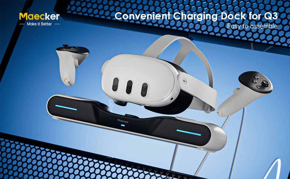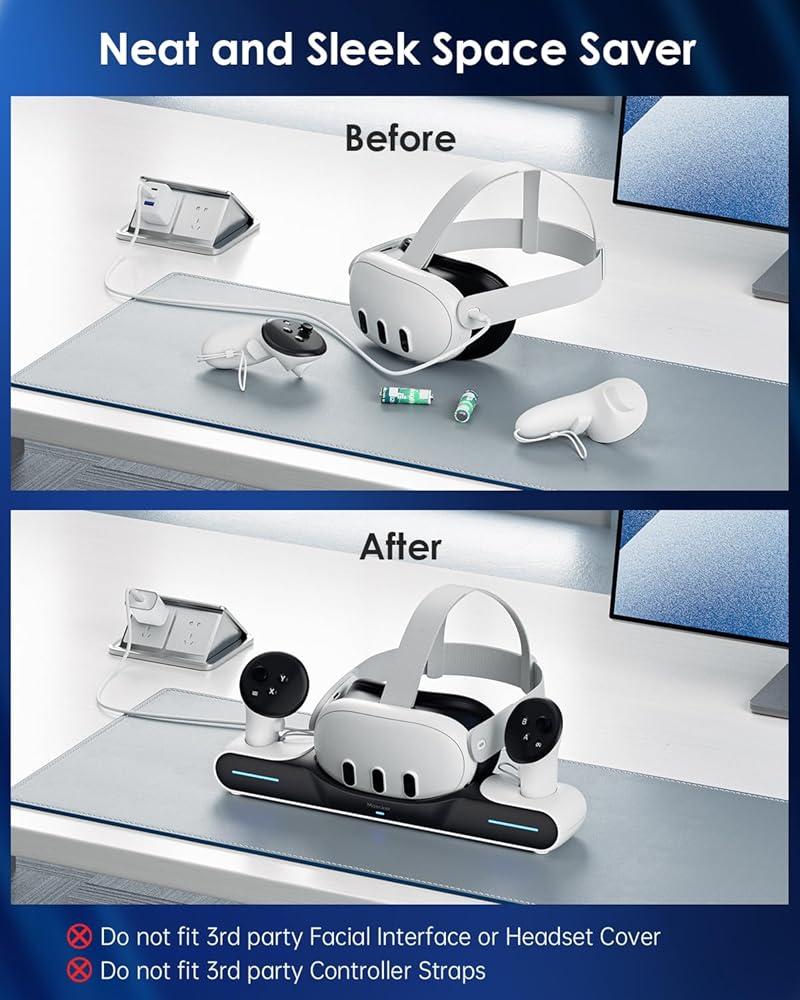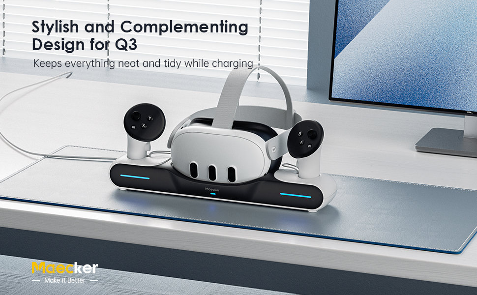 موفر مساحة أنيق وأنيق: تصميم أنيق ومكمل لقاعدة شحن oculus Quest 3. يحافظ على كل شيء أنيقًا ومرتبًا أثناء الشحن عن طريق استخدام منصة Maecker لقاعدة الشحن Meta Quest 3 لملحقات Meta Quest 3. عرض سماعة الواقع الافتراضي جميلة ونظيفة ومرتبة لشاحن Quest 3 وشاحن Quest 3.