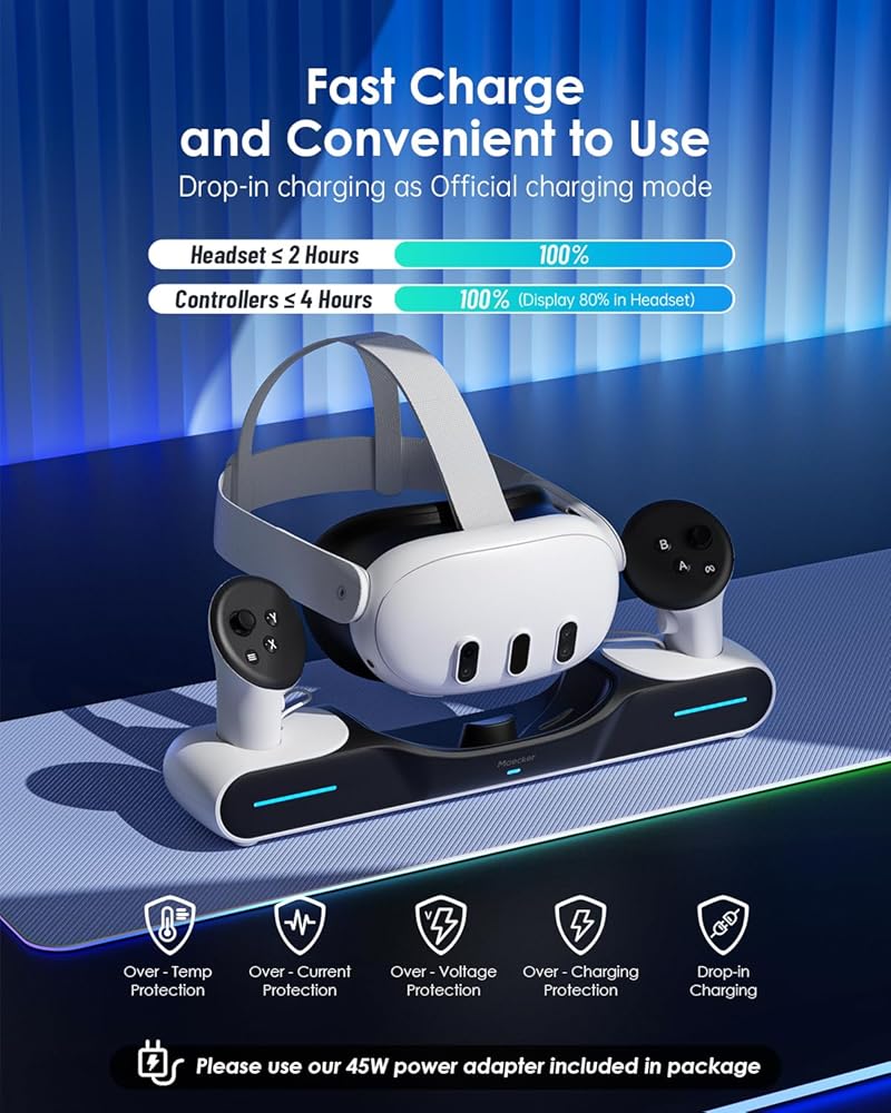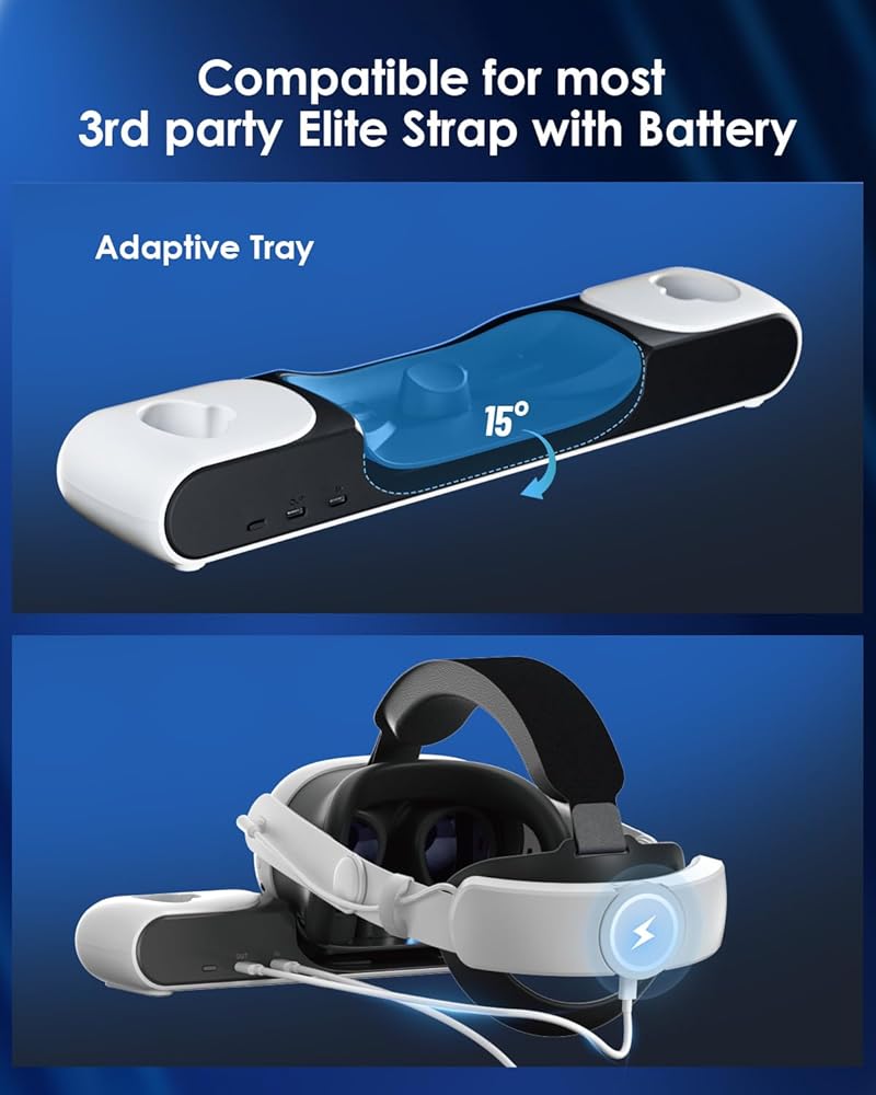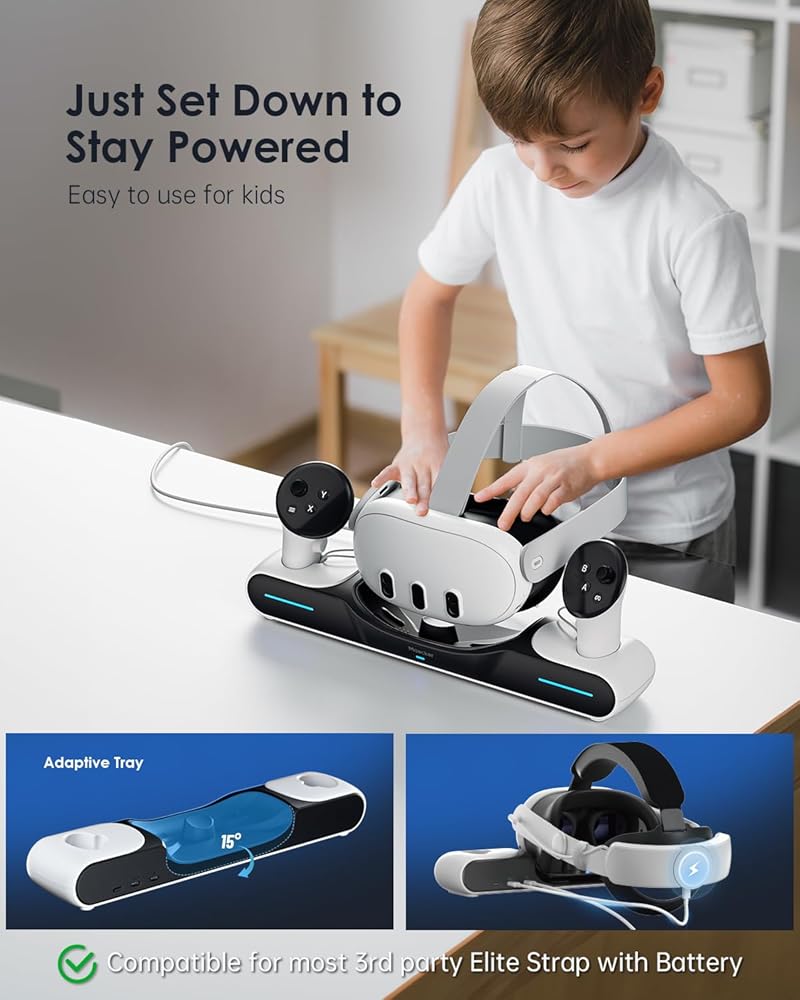 سهلة الاستخدام للأطفال: ما عليك سوى ضبطها لتظل مزوّدًا بالطاقة من خلال الشحن المنسدل. استخدام ودية للأطفال. متوافق مع معظم أحزمة رأس الطرف الثالث أو حزام النخبة المزود بالبطارية. من السهل تركيب قاعدة الشحن لمحطة الإرساء Quest 3. استخدم محول 45 واط الخاص بنا للحصول على شحن سريع لسماعة الرأس Quest 3 VR من فضلك. اضبط وحدات التحكم على حالة مستقرة حتى يضيء ضوء المؤشر.