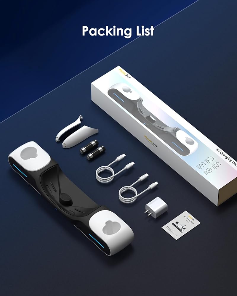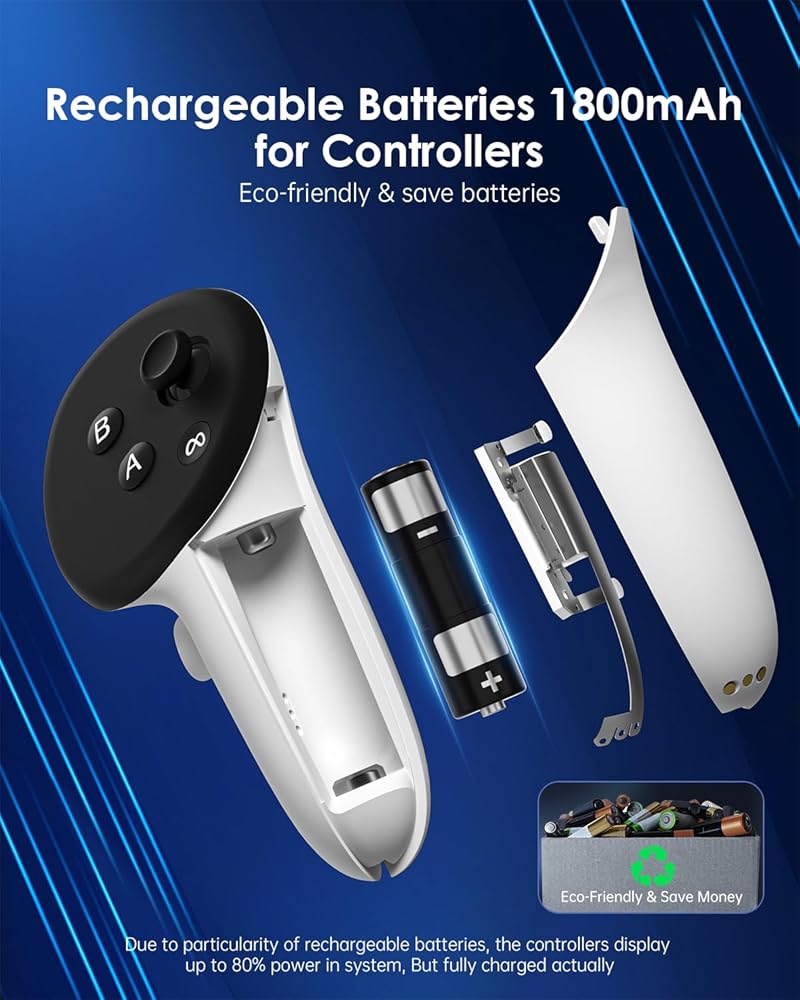 بطاريات قابلة للشحن 1800 مللي أمبير لوحدات التحكم: بطاريات صديقة للبيئة وموفرة. نظرًا لخصوصية البطاريات القابلة لإعادة الشحن، تعرض وحدات التحكم ما يصل إلى 80% من الطاقة في النظام، ولكنها مشحونة بالكامل بالفعل. التعبئة: 1 قاعدة شحن لـ Quest 3، 2 بطاريات قابلة للشحن، 2 غطاء بطارية وحدة التحكم، 2 كابلات USB C إلى C، 1 محول (45 وات)، 1 مستخدم Maual.