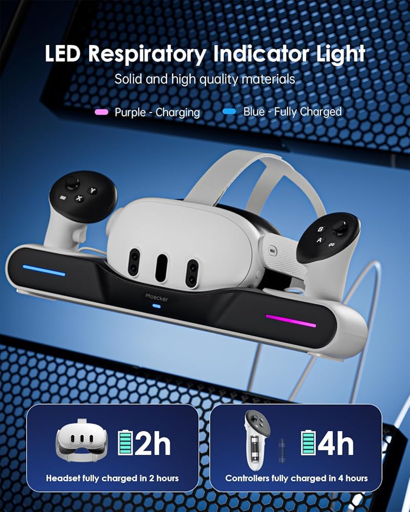 ضوء مؤشر LED للجهاز التنفسي: ضوء مؤشر LED للتنفس. مواد صلبة وعالية الجودة. الضوء الأرجواني: الشحن. الضوء الأزرق: مشحون بالكامل. محطة شحن ذات مظهر جميل لشاحن Quest 3. انقر على الزر الموجود في الخلف لإطفاء الضوء عند النوم. اقرأ دليل المستخدم قبل الاستخدام من فضلك.