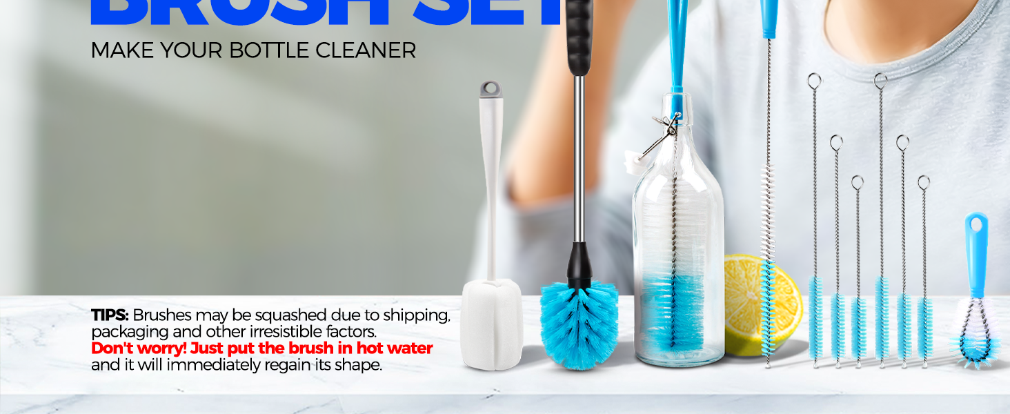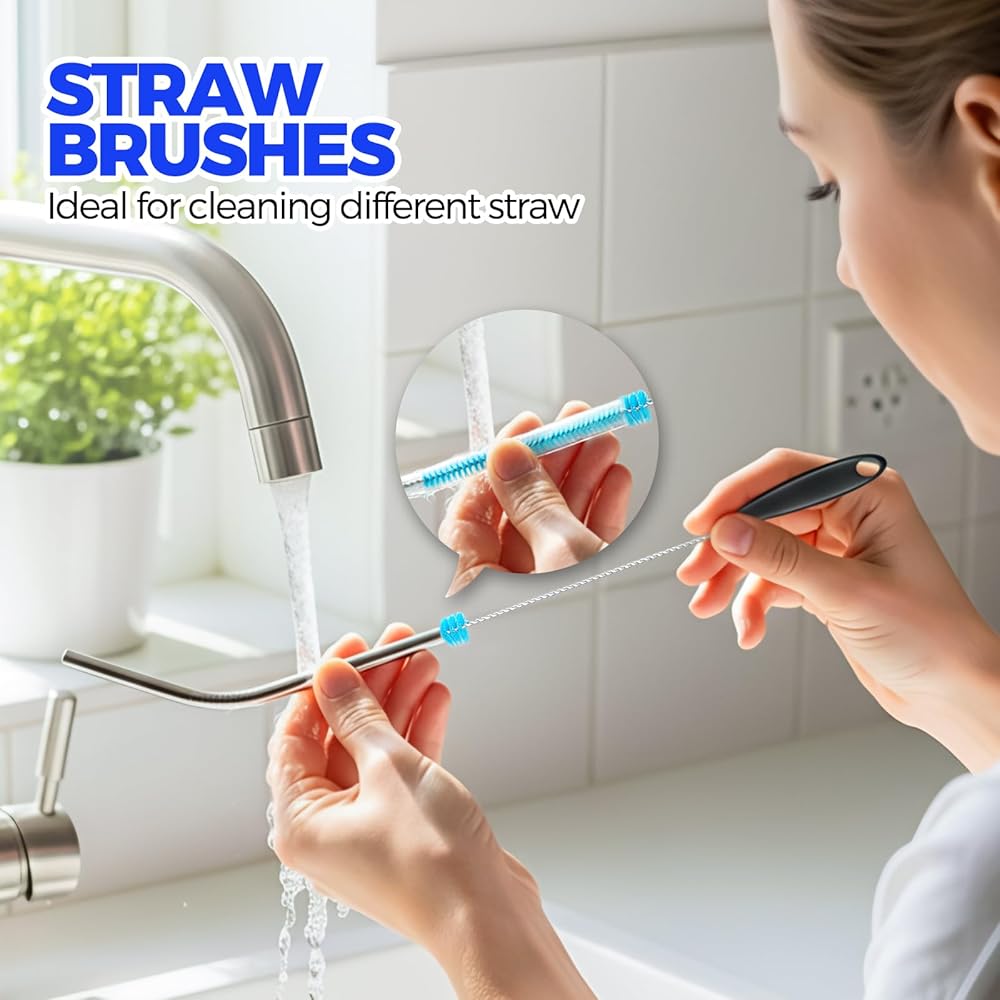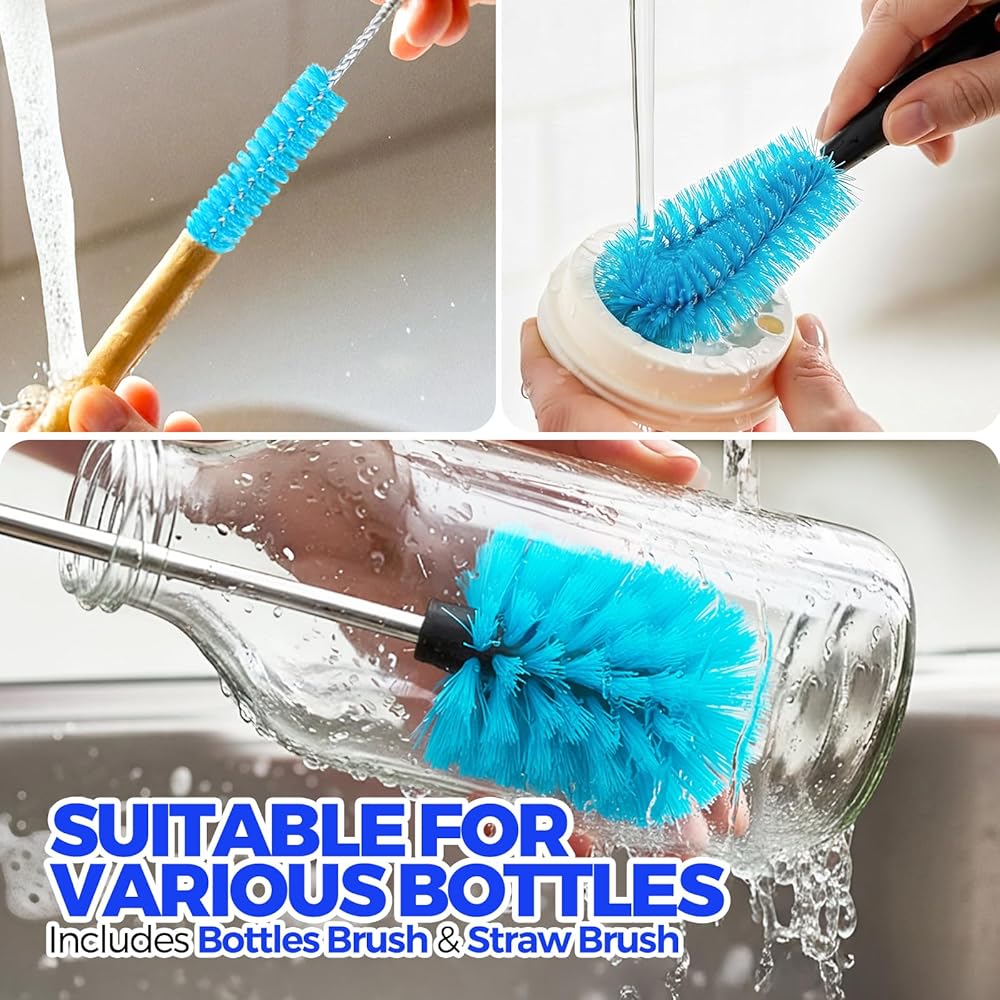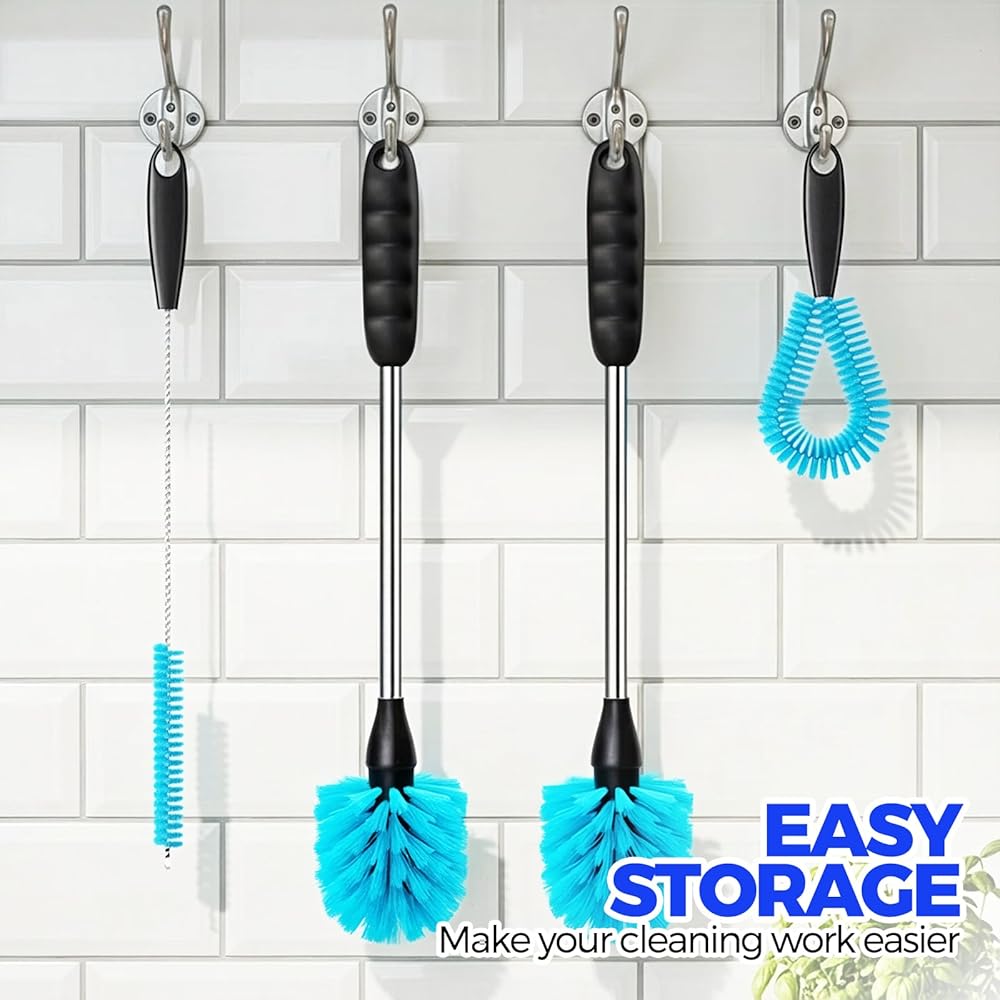 فرش التنظيف ذات الاستخدام المتعدد تتضمن فرش تنظيف أنبوبية من القش مقاس 7.9-12.5 بوصة، وفرشاة زجاجات البيرة بمقبض طويل 16 بوصة، وفرشاة زجاجات المياه الرياضية مقاس 14 بوصة، وفرشاة إسفنجية متعددة الوظائف مقاس 10 بوصات، وفرشاة تنظيف فوهة بطول 4.3 بوصات؛ يمكنك تعليقها على الخطاف للتجفيف والتخزين.