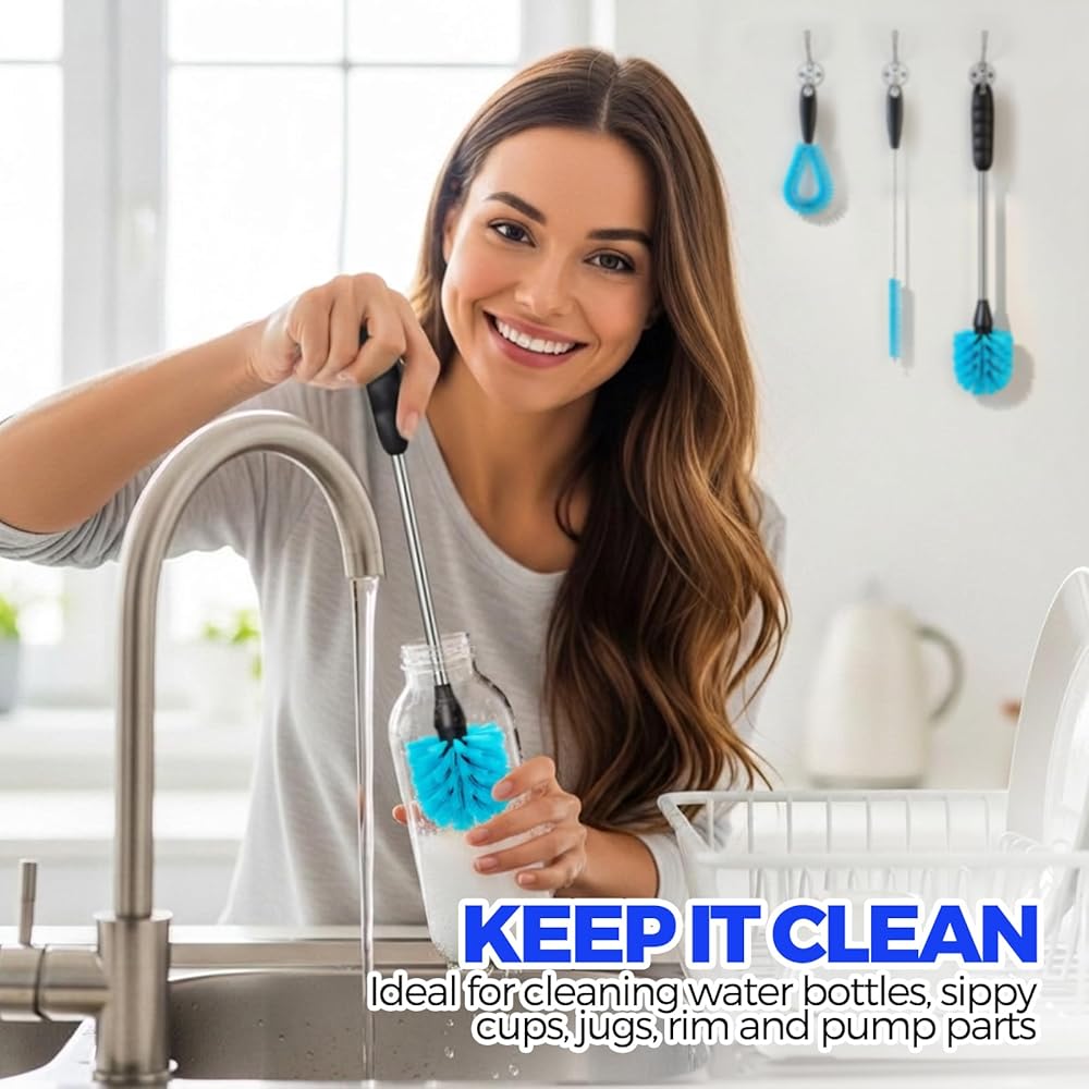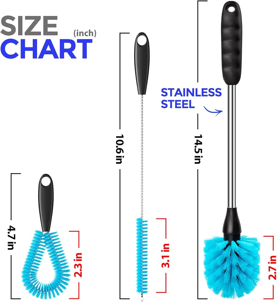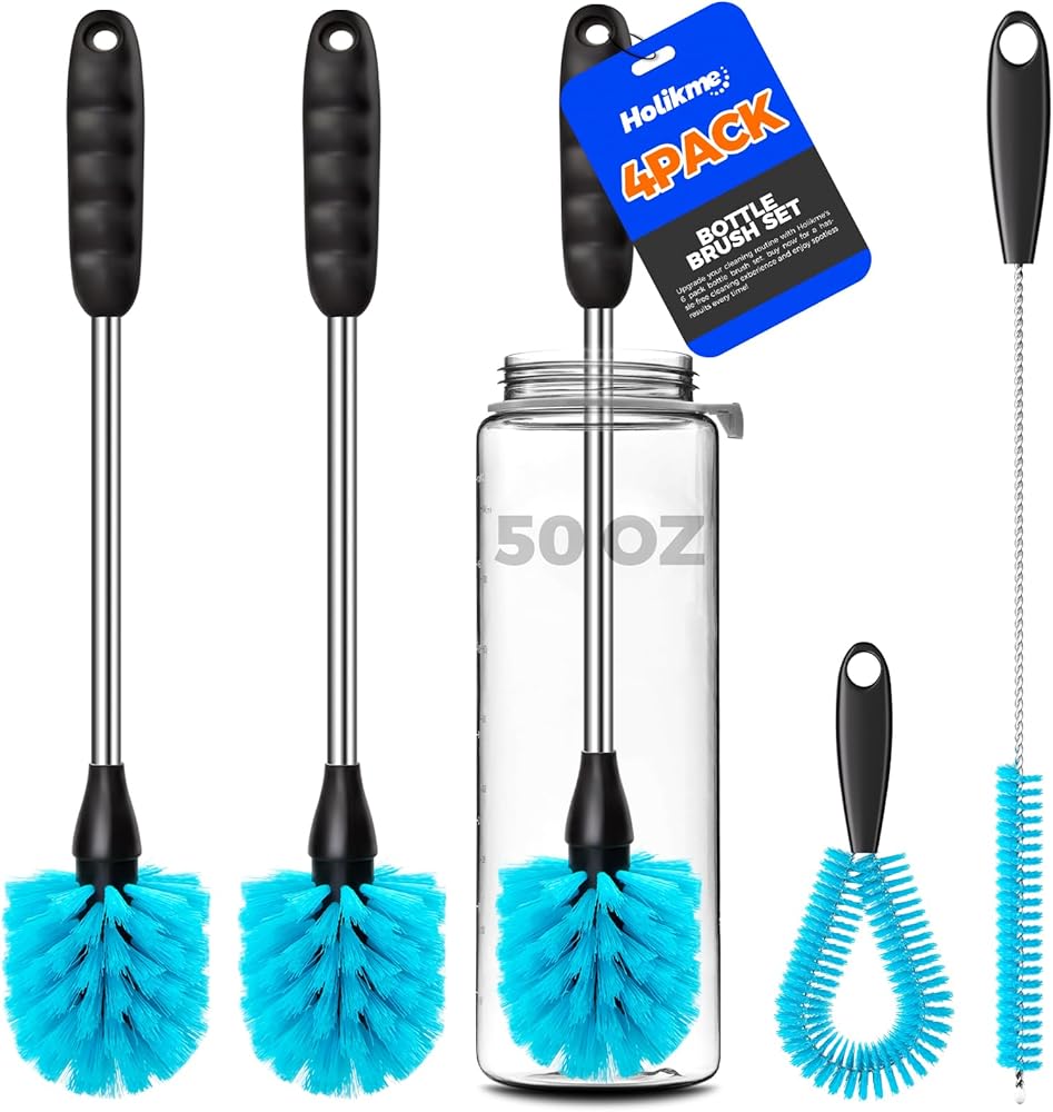 مجموعة فرش الزجاجات المكونة من 4 قطع من Holikme، فرشاة تنظيف الزجاجات المصنوعة من الفولاذ المقاوم للصدأ بمقبض طويل 14.5 بوصة، فرش الزجاجات المصنوعة من الفولاذ المقاوم للصدأ 4 في 1 ذات مقبض طويل لزجاجة المياه والأكواب وفرش العجلات الكاشطة، باللون الأزرق