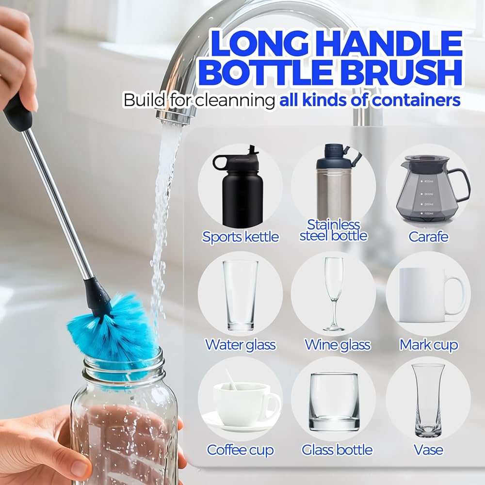 فرشاة تنظيف طويلة للغاية مقاس 16 بوصة مع شعيرات عريضة للغاية مقاس 2.45 بوصة يمكنها الوصول بسهولة إلى الجزء السفلي وتنظيف جميع المناطق الداخلية، وهي مثالية للنبيذ طويل الرقبة الضيق وزجاجات البيرة ومغذي الطيور الطنانة ولوحة مفاتيح الكمبيوتر المحمول.