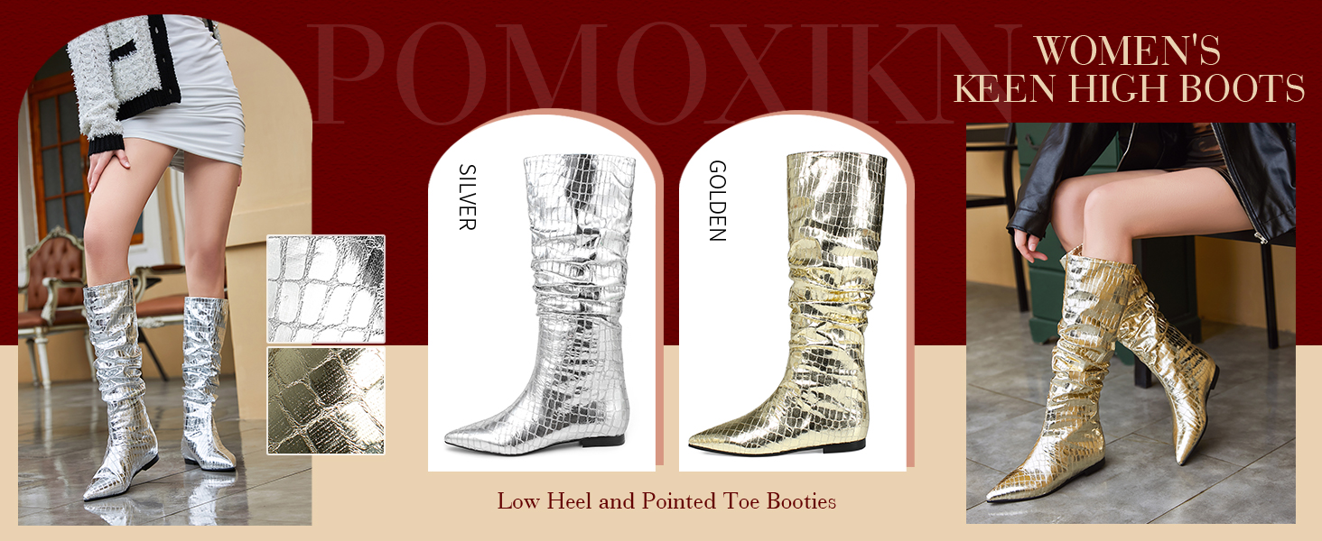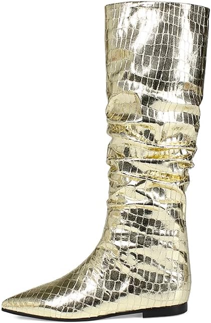 أحذية عالية للركبة للنساء، أحذية ذهبية وفضية للنساء، أحذية مسطحة معدنية مترهلة، أحذية بكعب مكتنز، أحذية مسطحة من جلد التمساح الصناعي.