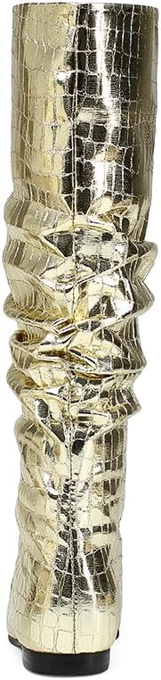 ★التصميم: تتميز هذه الأحذية الطويلة حتى الركبة بتصميم فضفاض وجلد تمساح معدني أنيق يشكل مقدمة مدببة كلاسيكية، وكعب مكتنز مريح ومسطح وسحب متوسط على الساق، مما يزين ساقك ويطيل ساقيك.