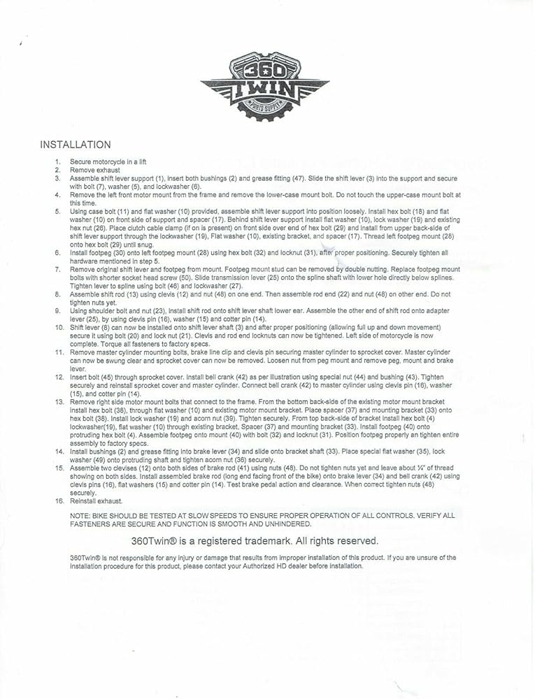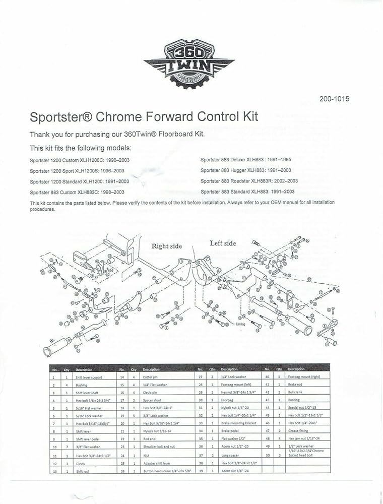Fits the following models: Sportster 1200, Custom XLH1200C (96-03) Sportster 1200, Sport XLH1200S (96-03) Sportster 1200, Standard XLH1200 (91-03) Sportster 883, Custom XLH883C (98-03) Sportster 883, Deluxe XLH883 (91-95) Sportster 883, Hugger XLH883 (91-03) Sportster 883, Roadster XLH883R (02-03) Sportster 883, Standard XLH883 (91-03) The 360 Twin Forward Control Kit for Sportsters is a premium, solid steel chrome forward control set that offers the perfect replacement for your mid-mounted controls. Designed to provide exceptional rider comfort, usability, and easy installation, these forward controls are an excellent choice for anyone looking to enhance their Sportster motorcycle's performance and riding experience. Constructed with high-quality, chrome-plated solid steel, these forward controls are not only built to last but also add a touch of style and elegance to your motorcycle. The easy installation process makes it simple for riders to upgrade their bike's controls without the need for professional assistance, allowing you to get back on the road in no time. One of the standout features of the kit is its fully adjustable design, which allows riders to fine-tune their controls for optimal comfort and usability. Whether you prefer a more aggressive riding position or a relaxed cruising stance, these controls can be adjusted to suit your individual preferences and riding style. The forward controls also come equipped with a reversible shifter arm, which provides added versatility and customization options for riders. This feature allows you to choose the ideal shifter arm position, ensuring seamless gear changes and a more enjoyable riding experience. The kit includes all necessary mounting hardware, making installation a breeze for even the most novice riders. O-ring style foot and shift pegs are also included, providing a comfortable and secure grip for your feet during gear changes and while maintaining a steady riding position.