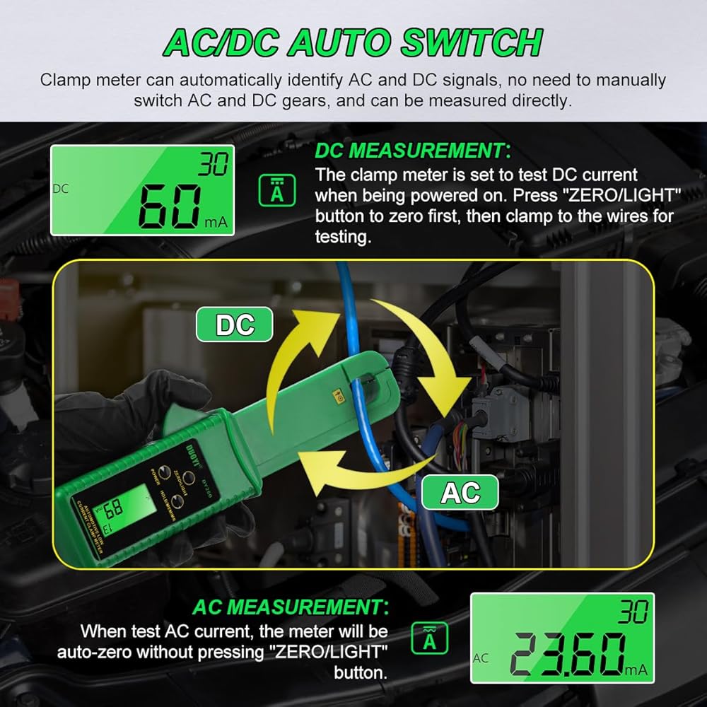 【التعرف التلقائي على التيار المتردد/التيار المستمر، لا حاجة للتبديل يدويًا، يحتوي جهاز قياس المشبك على وظيفة التبديل التلقائي للتيار المتردد/التيار المستمر، ويمكن قياسه مباشرة. تم ضبط جهاز قياس المشبك AC/DC لاختبار تيار التيار المستمر عند تشغيله. اضغط على زر "ZERO/LIGHT" إلى الصفر أولاً، ثم ثبت الأسلاك للاختبار. عند اختبار تيار التيار المتردد، سيكون مشبك أمبير صفرًا تلقائيًا دون الضغط على زر "ZERO/LIGHT". (ملاحظة: يرجى الضغط على مفتاح ZERO/LIGHT قبل الاختبار لإجراء تعديل الصفر التلقائي.)