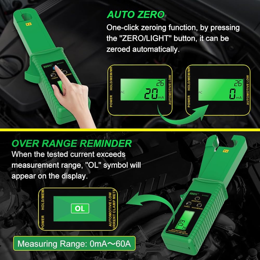 【تذكير تلقائي بالمدى والصفر】يحتوي جهاز قياس المشبك على وظيفة تصفير بنقرة واحدة، عن طريق الضغط على زر "صفر/ضوء"، يمكن تصفيره تلقائيًا، مقارنةً بتدوير مقبض الصفر يدويًا، فإن التشغيل أكثر ملاءمة. نطاق القياس لمقياس المشبك هو 0 مللي أمبير ~ 60 أمبير تيار متردد/تيار مستمر، عندما يتجاوز التيار المختبر نطاق القياس، سيظهر رمز "OL" على الشاشة. عندما يكون جهد البطارية منخفضًا جدًا، ستعرض الشاشة رمز البطارية، ويجب استبدال البطارية على الفور.
