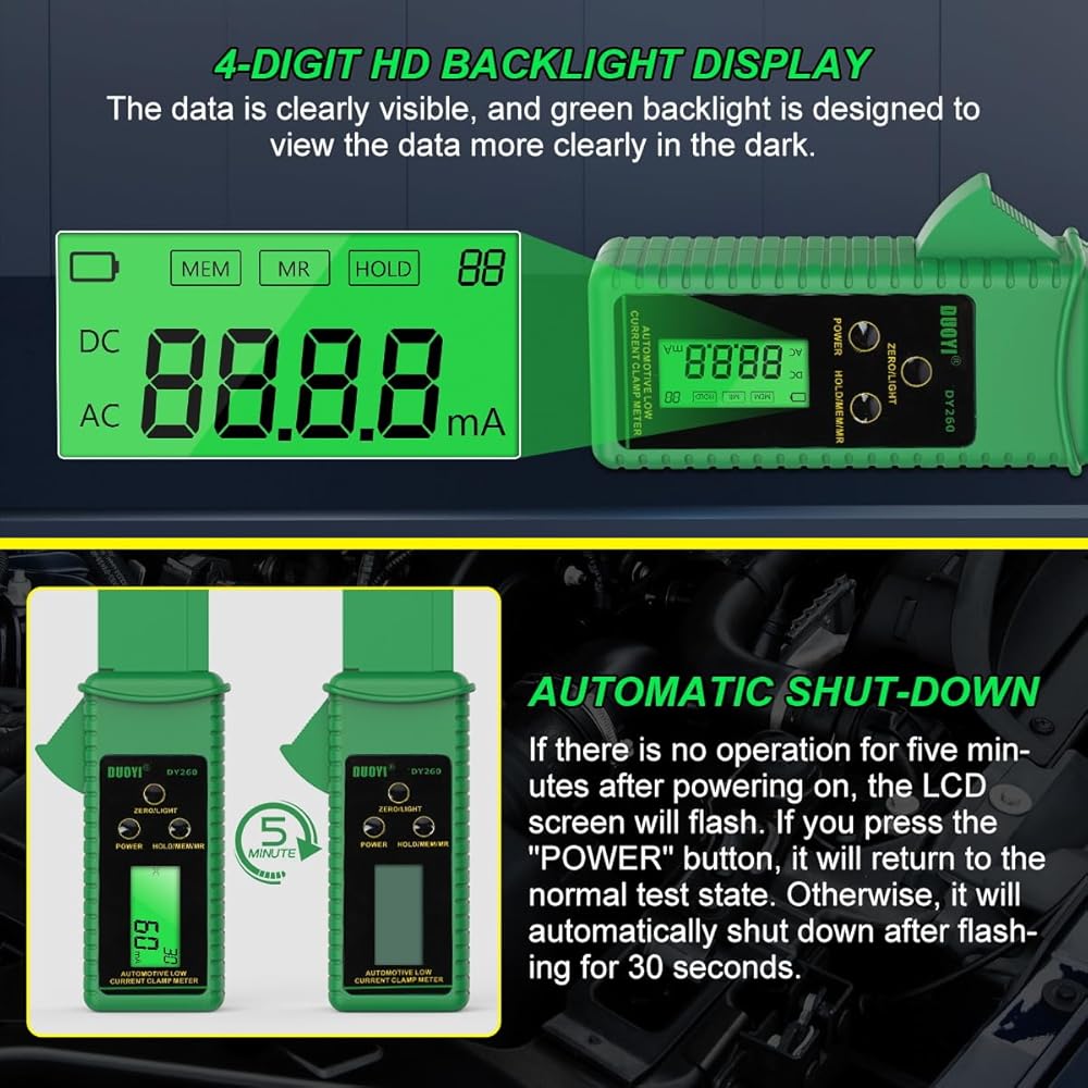 【شاشة عرض خلفية عالية الدقة وإيقاف تلقائي】يحتوي جهاز قياس أمبير DC على شاشة LCD مكونة من 4 أرقام مع إضاءة خلفية، والتي يمكنها قراءة البيانات بسهولة حتى في البيئات الخافتة أو المظلمة، وتم تصميم الإضاءة الخلفية الخضراء لعرض البيانات بشكل أكثر وضوحًا في الظلام. من أجل توفير الطاقة، إذا لم يتم التشغيل لمدة خمس دقائق بعد التشغيل، فستومض شاشة LCD. إذا قمت بالضغط على زر "الطاقة"، فسوف يعود إلى حالة الاختبار العادية. وإلا، فسيتم إيقاف تشغيله تلقائيًا بعد الوميض لمدة 30 ثانية.