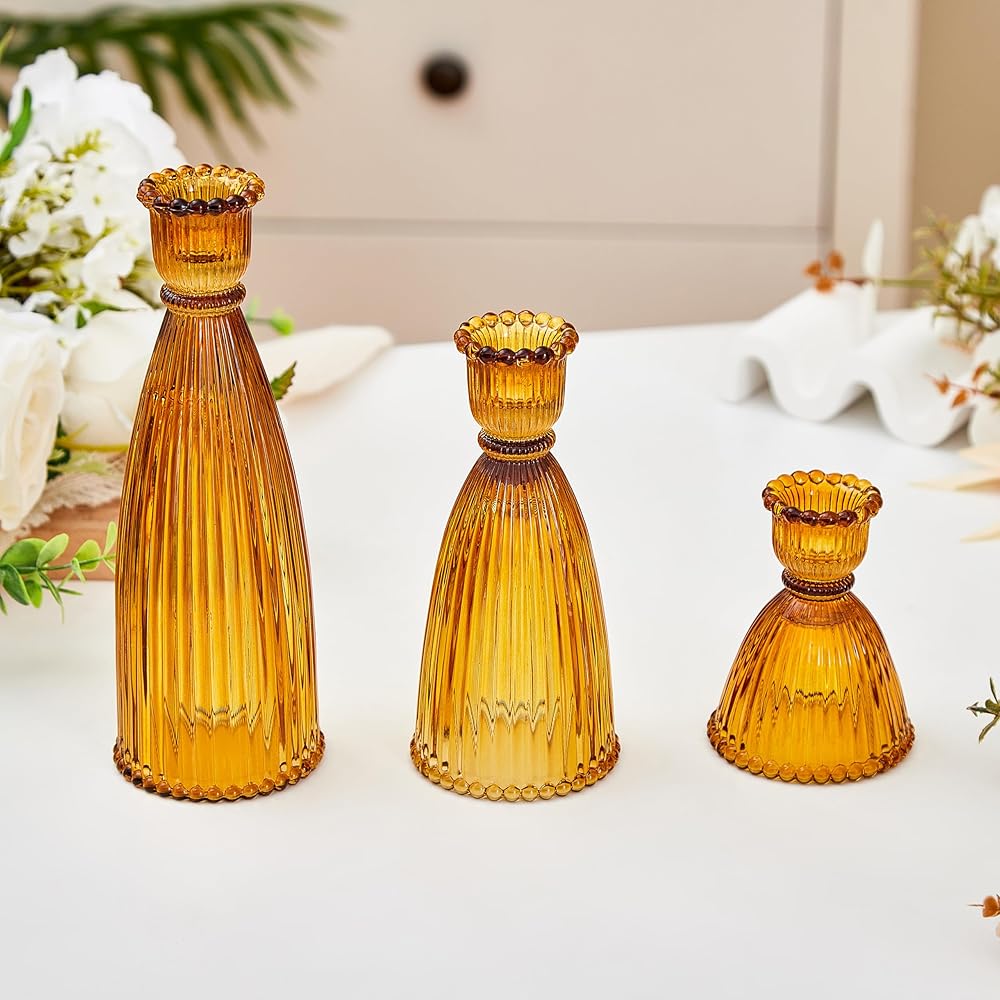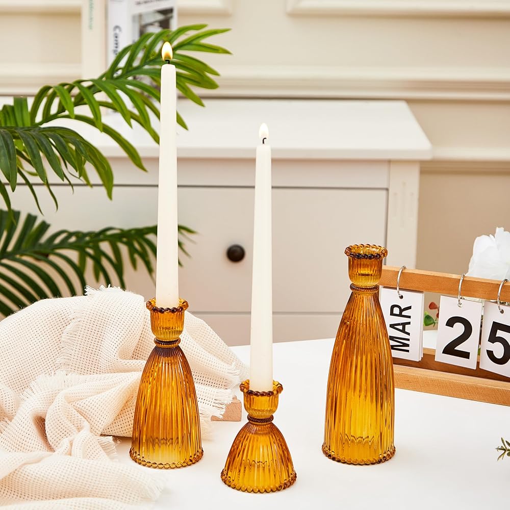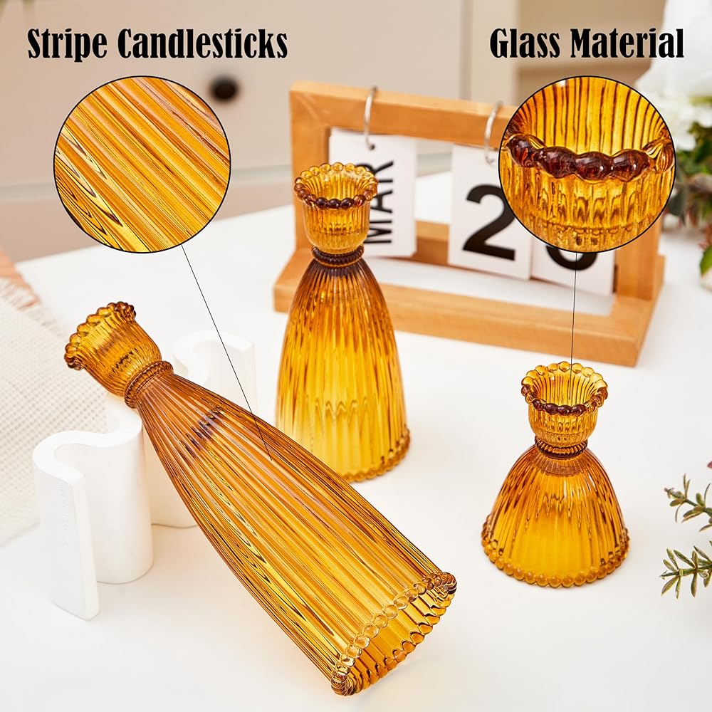 • ☀ 【شمعدانات مخططة ملونة】- مجموعة حامل الشموع الجميلة هذه تأتي في 3 أبعاد وألوان مختلفة. تعمل الخطوط العمودية التي لا مثيل لها على زيادة الجاذبية البصرية. تستوعب حاملات الشموع هذه للقطعة المركزية للطاولة أنماط التصميم الداخلي المتنوعة.