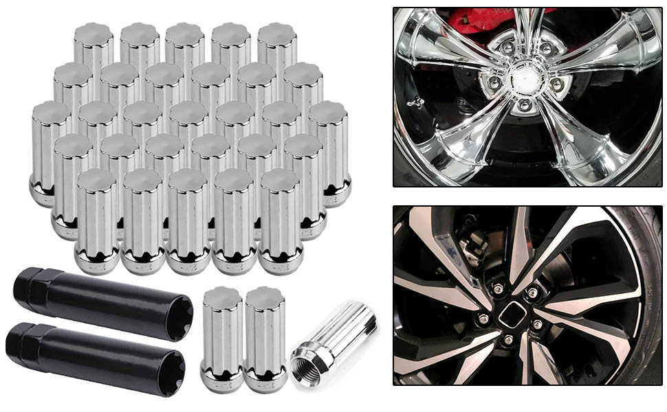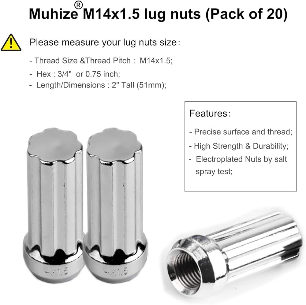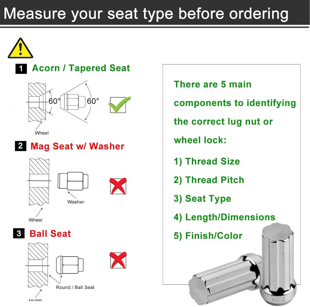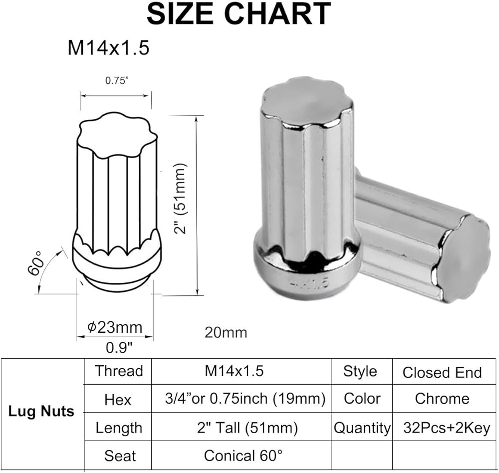 الملاءمة - هذه الصواميل المصنوعة من الكروم تناسب عادة العجلات ذات مسافة خيط M14x1.5 ومقعد مخروطي 60 درجة. يمكنك مطابقة مواصفات العروة (نمط الجلوس الملولب السداسي وما إلى ذلك) لتلبية متطلبات سيارتك وعجلتك (مرجع السيارة)