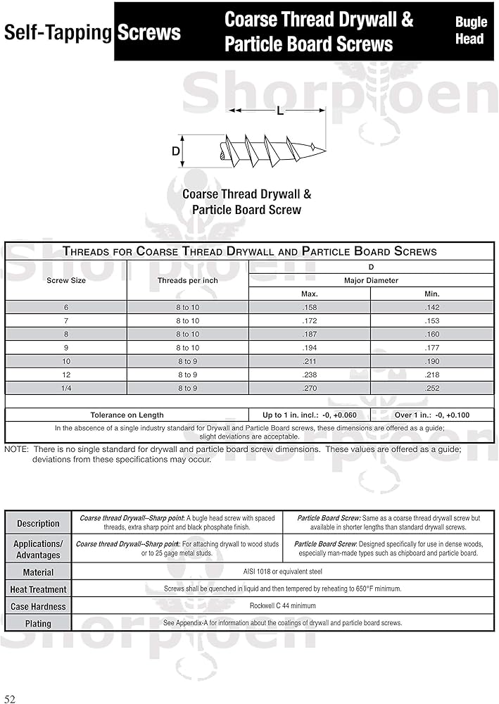• Coarse thread Drywall--Sharp point: For attaching drywall to wood studs or to 25 gage metal studs. Particle Board Screw: Designed specifically for use in dense woods, especially man-made types such as chipboard and particle board