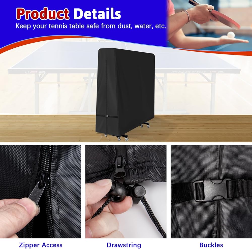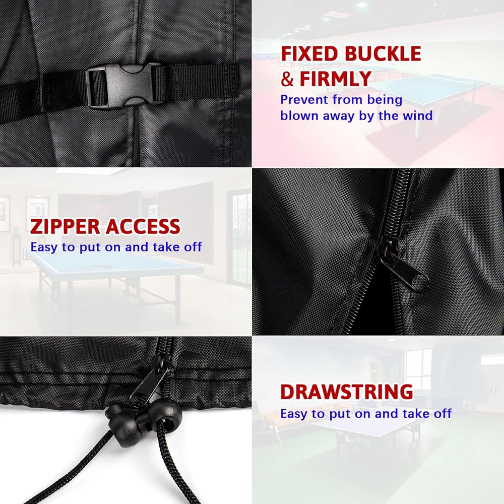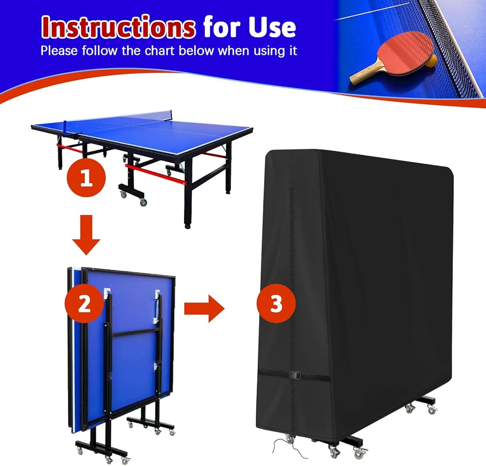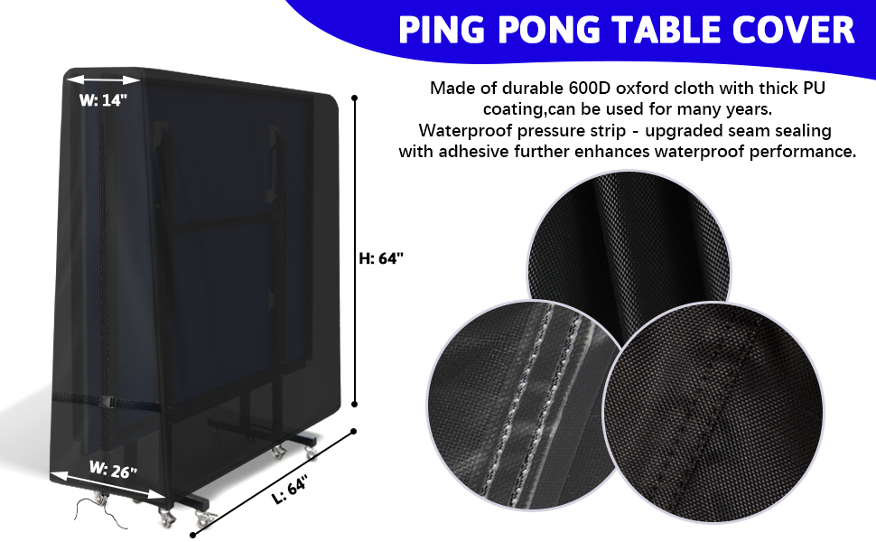 مادة مقاومة للماء - غطاء طاولة بينج بونج الخاص بنا أكثر سمكًا من الأنواع الشائعة. مصنوع من قماش أكسفورد بوليستر 600D وطلاء PVC. يمكنه مقاومة الغبار والماء والرياح وأشعة الشمس. إنها ليست مناسبة للاستخدام الداخلي فقط ولكنها أيضًا مثالية للحماية الخارجية من جميع الأحوال الجوية لطاولة تنس الطاولة.